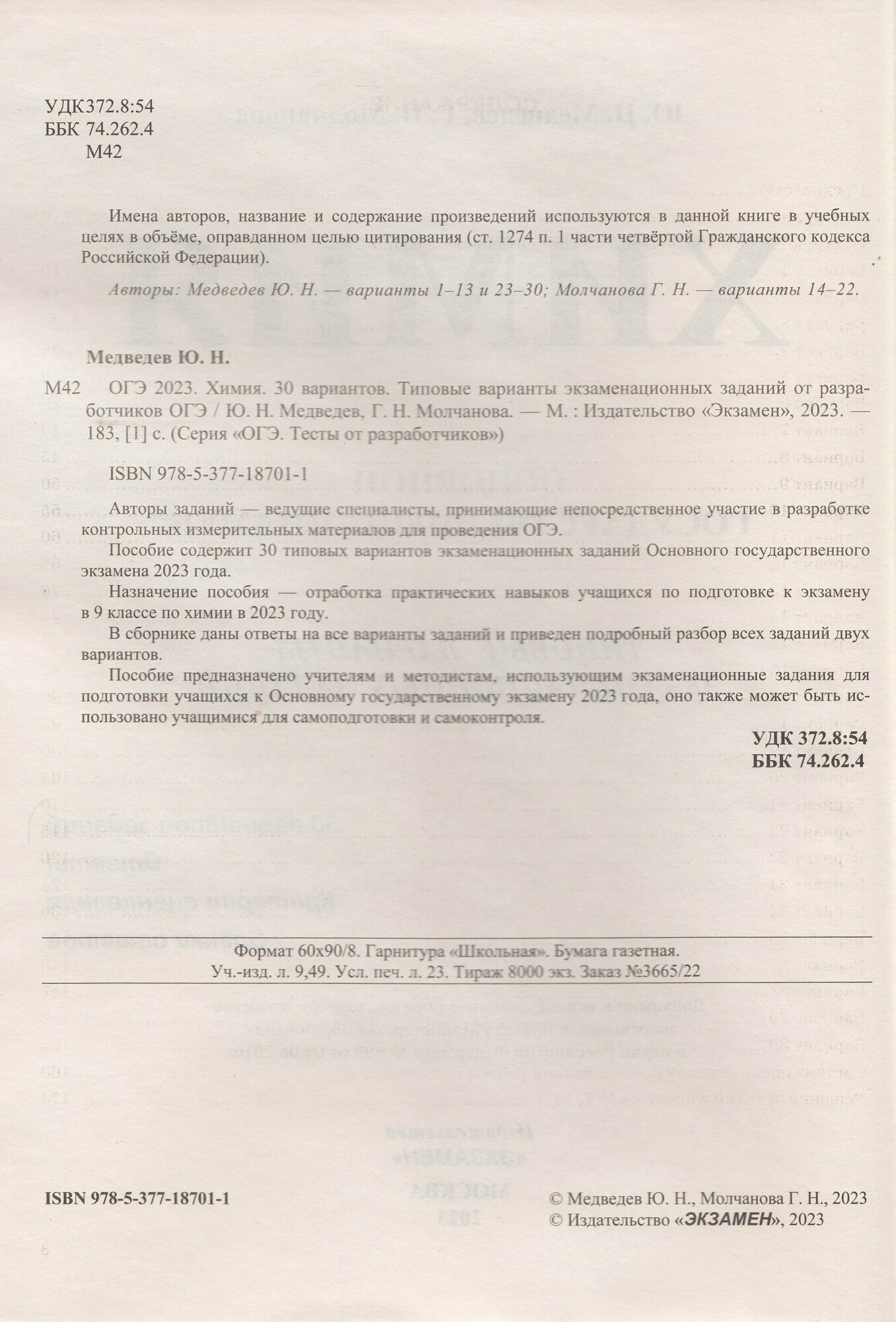 ОГЭ 2023 Химия. Типовые варианты экзаменационных заданий. 30 вариантов (Медведев Юрий Николаевич; Молчанова Галина Николаевна); Экзамен, 2023