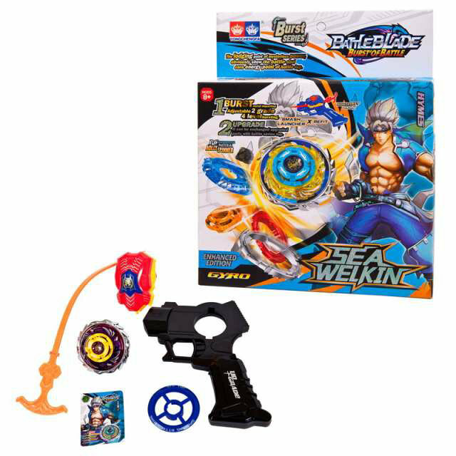 Комплектность: волчок, пусковая установка, карточка, рукоятка, пусковая полоса, диск для запуска.