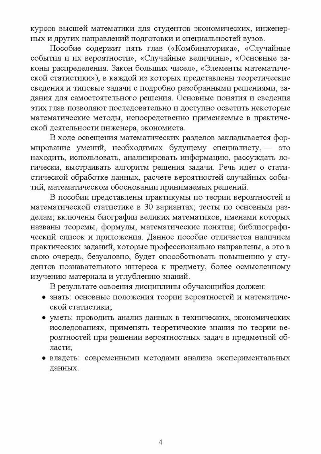 В практикуме изложены теоретические и практические основы курса «Теория вероятностей и математическая статистика». Пособие подготовлено в соответствии с требованиями федеральных государственных образовательных стандартов высшего образования по направлению подготовки 01.03.02 «Прикладная математика и информатика» и специальности 10.05.04 «Информационно-аналитические системы безопасности» (специализация «Технологии информационно-аналитического мониторинга»), в соответствии с программами учебной дисциплины «Теория вероятностей и математическая статистика». Для студентов высших учебных заведений, обучающихся по инженерно-техническим, естественно-научным и экономическим направлениям.