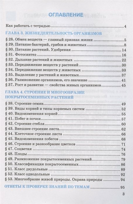 Структура рабочей тетради соответствует тематической структуре учебника В. В. Пасечника и др. «Биология. 5-6 классы. Линия жизни». Особое внимание уделено заданиям, помогающим шестиклассникам подготовиться к ВПР. Эти задания в тетради отмечены специальным значком — Задание ВПР. Они направлены на формирование у учащихся практических умений по распознаванию биологических объектов, нахождению сходства и различий между ними, анализу биологической информации, ее преобразованию из одного вида в другой, решению задач, проведению наблюдений и лабораторных работ, формулировке выводов.