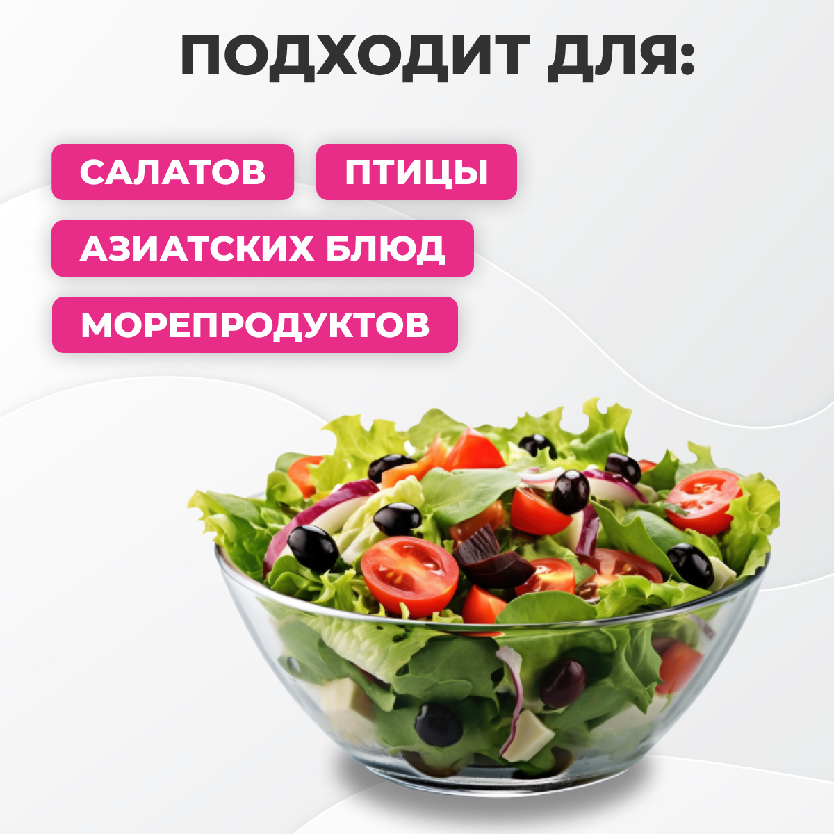Идеальна для салатов из овощей, а также салатов с морепродуктами или мясом прожарки медиум.