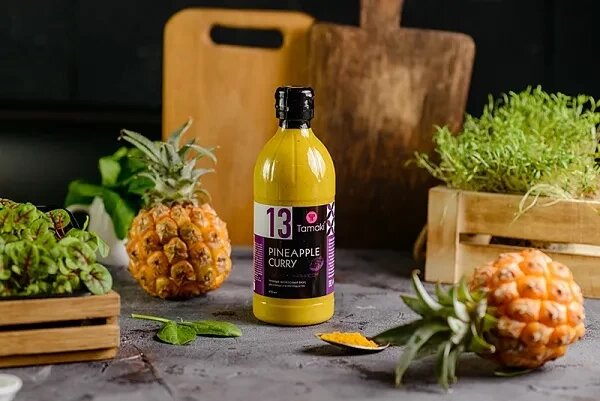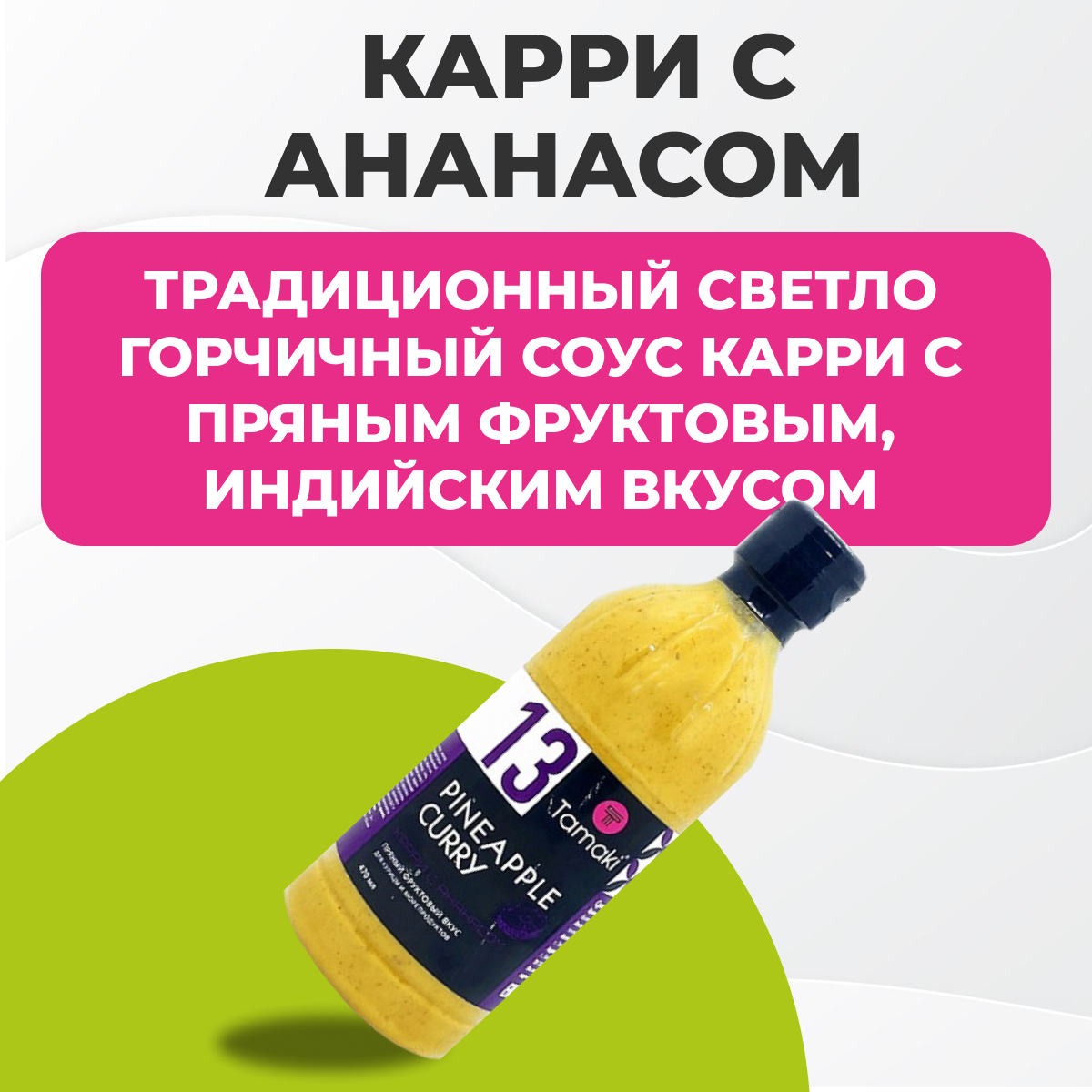 Традиционный светло-горчичный соус карри с нежным аутентичным индийским вкусом. Отлично подходит для приготовления курицы, сочетается с рыбой и морепродуктами, используется в качестве заправки для салатов с белым мясом. Соус карри отличается тем, что изготавливается из свежего ананаса. Это не консервированный, не сушенный, а именно свежемороженый ананас. Ананас бережно размораживается и взбивается в нежную эмульсию. Кремовая консистенция обволакивает все ингредиенты блюда, связывая их в единое целое.