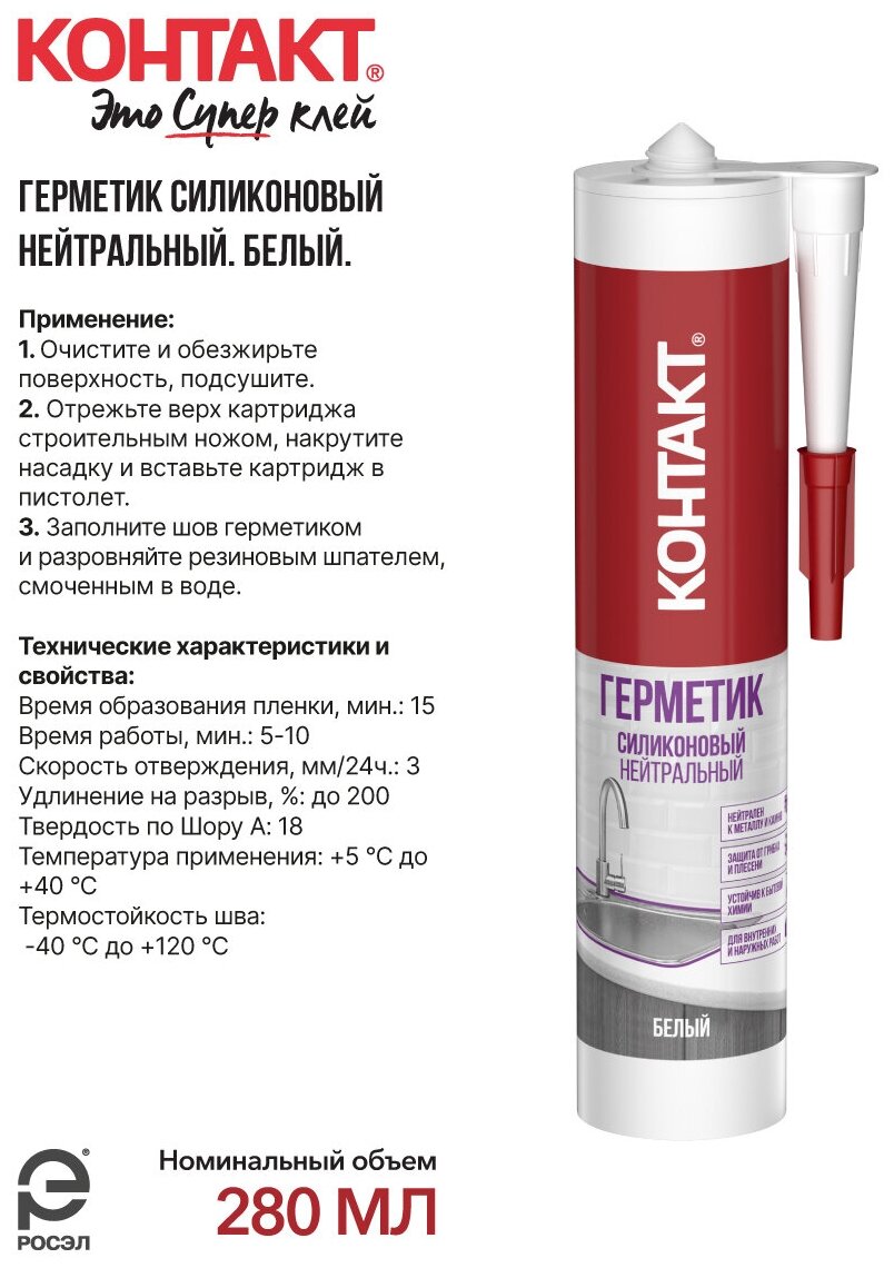 Герметики КОНТАКТ обеспечивают надежное уплотнение стыков и соединений между различными конструктивными элементами внутри и снаружи помещений. Герметики КОНТАКТ противостоят накапливанию и распространению влаги и плесени, защищают помещения от сквозняков.Высокое качество компонентов, европейские производственные линии и рецептуры ставят герметики КОНТАКТ в один ряд с мировыми лидерами индустрии.Универсальный силиконовый герметик с нейтральным отверждением. Не вызывает коррозии металлов, не вступает в реакцию с щелочными поверхностями, устойчив к образованию плесени и грибков. Предназначен для герметизации стыков и швов между различными конструктивными элементами при проведении монтажных и отделочных работ внутри и снаружи помещения. ВАЖНО! Не использовать для работы с полиэтиленом, полипропиленом, тефлоном, битумом и поверхностями постоянно подвергающихся воздействию воды. Особенности: Не вызывает коррозии металлов. Не меняет цвет натурального камня. Без запаха. Устойчив к перепадам температуры, влажности, УФ излучению. Противостоит образованию плесени и грибка. Прозрачный (незаметный) шов. Для внутренних и наружных работ. Устойчив к воздействию бытовой химии.