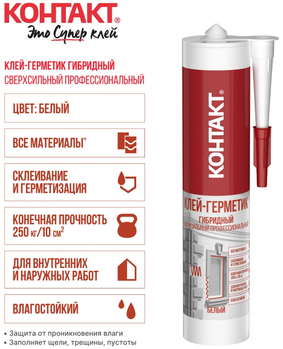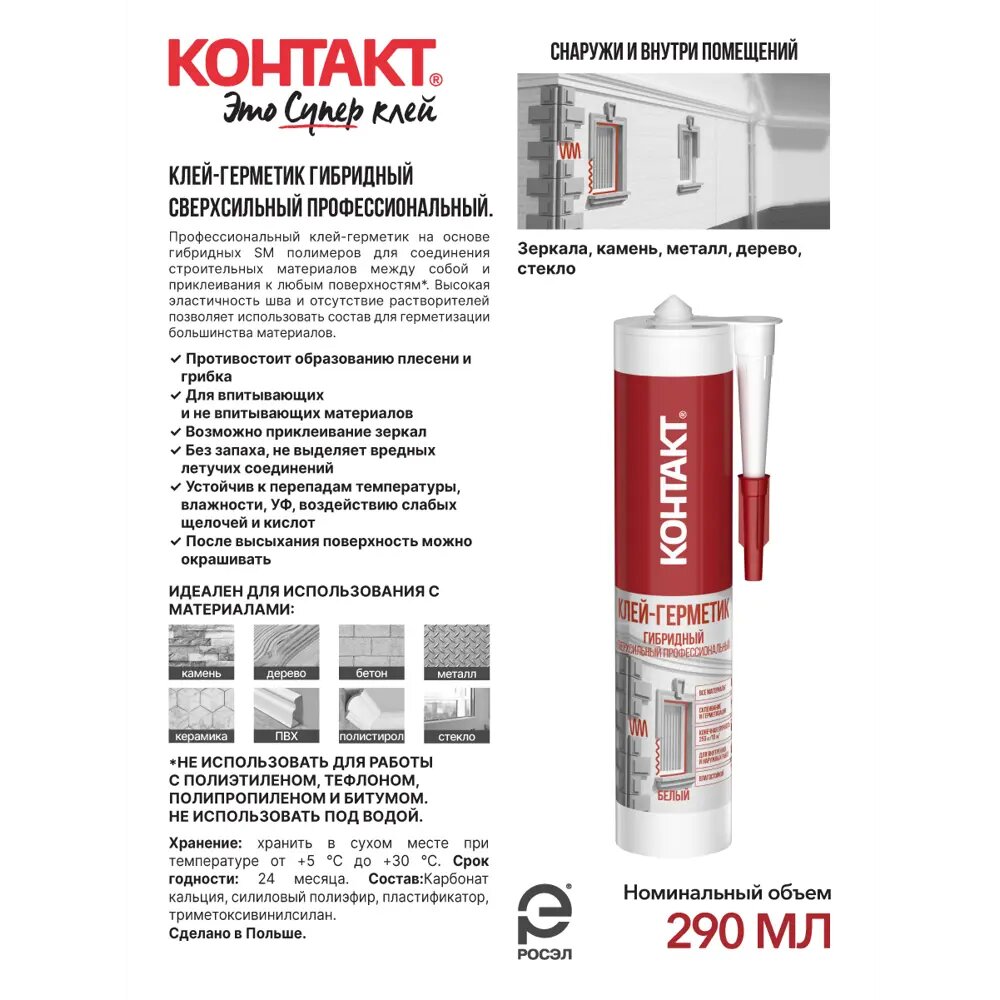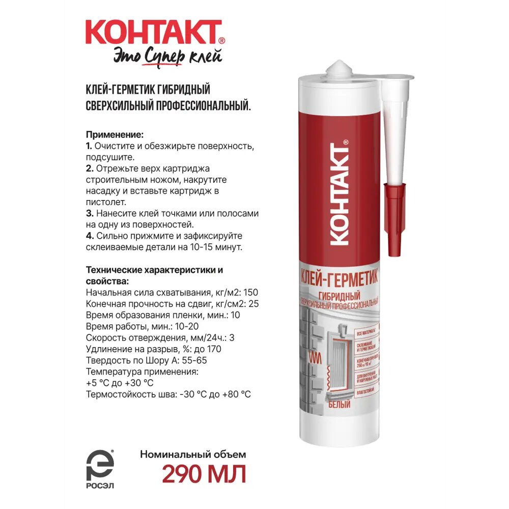 Клеи-герметики КОНТАКТ производятся по уникальной технологии гибридных полимеров, благодаря чему они могут использоваться как для приклеивания любых материалов, так и для герметизации швов. Профессиональный эластичный прозрачный нейтральный клей-герметик основе гибридных SM полимеров. Предназначен для герметизиции и склеивания материалов между собой и приклеивания к любым поверхностям*, вне зависимости от их впитывающей способности, при проведении монтажных и отделочных работ внутри и снаружи помещения. Можно использовать на влажных поверхностях. Важно! Не использовать для работы с полиэтиленом, полипропиленом, тефлоном и битумом. Особенности: Сочетает в себе все преимущества монтажных клеев и герметиков: сильное и быстрое схватывание, надежная герметизация, защита от грибка, устойчивость к перепадам влажности и температур, экологически безопасный.