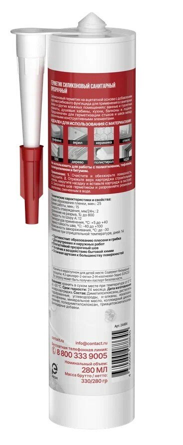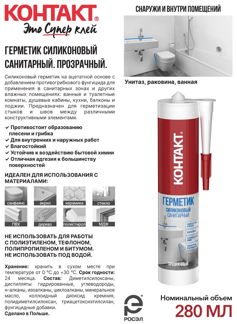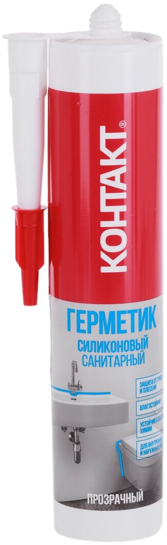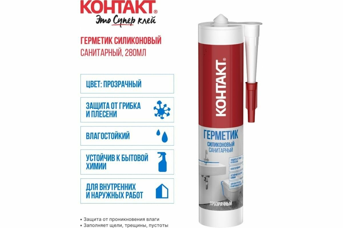 Герметики КОНТАКТ обеспечивают надежное уплотнение стыков и соединений между различными конструктивными элементами внутри и снаружи помещений. Герметики КОНТАКТ противостоят накапливанию и распространению влаги и плесени, защищают помещения от сквозняков.Высокое качество компонентов, европейские производственные линии и рецептуры ставят герметики КОНТАКТ в один ряд с мировыми лидерами индустрии.Cиликоновый герметик на ацетатной основе с добавлением противогрибкового фунгицида для применения в санитарных зонах и других влажных помещениях: ванные и туалетные комнаты, душевые кабины, кухни, балконы и лоджии. Предназначен для герметизации стыков и швов между различными конструктивными элементами при проведении монтажных и отделочных работ внутри и снаружи помещения. Важно! Не использовать для работы с полиэтиленом, полипропиленом, тефлоном, битумом и поверхностями постоянно подвергающихся воздействию воды. Особенности: Защита от грибка и плесени. Влагостойкость. Прозрачный (незаметный) шов. Устойчив к бытовой химии.