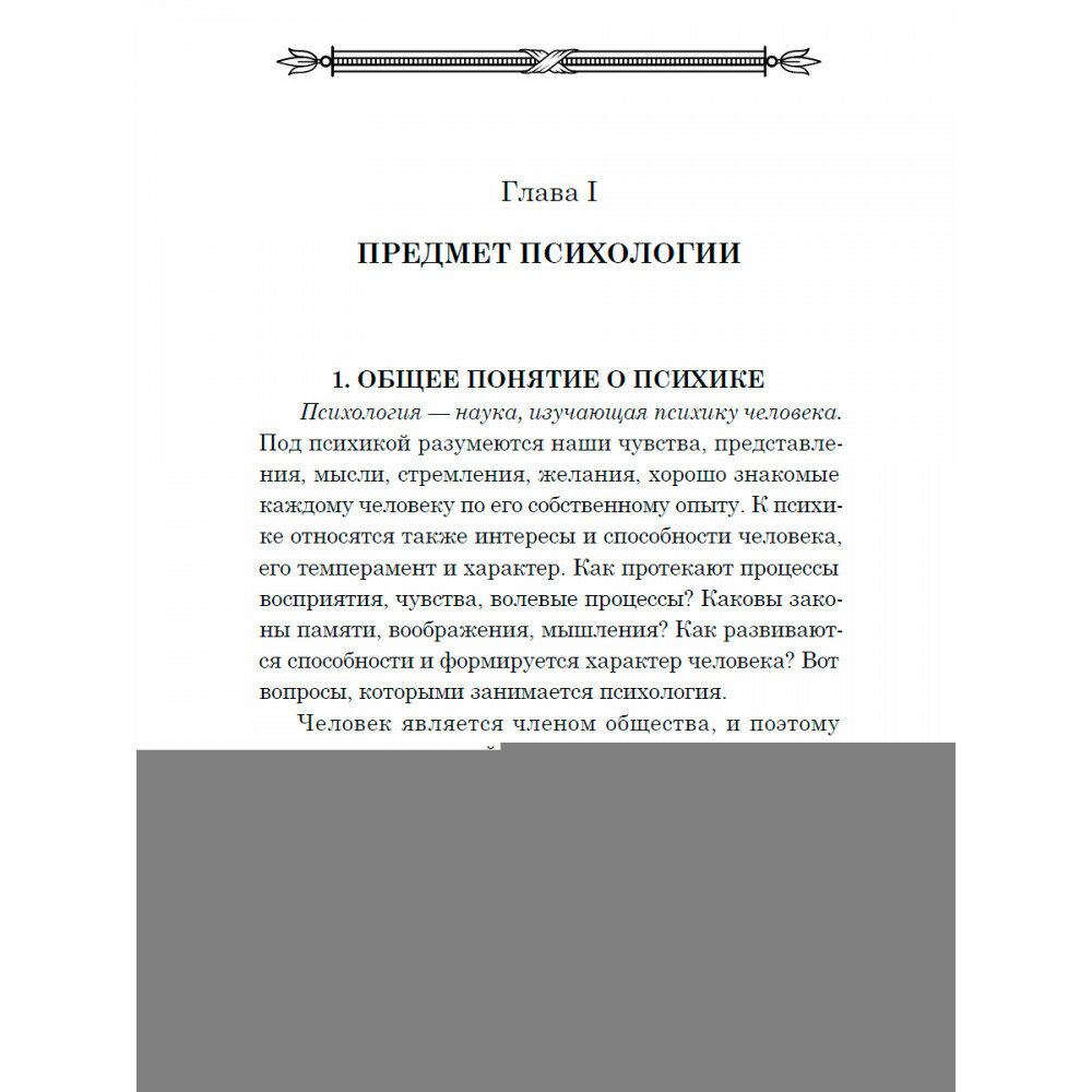 Наши мысли, чувства, способности, желания и стремления относятся к области, именуемой психикой. Именно она является предметом изучения науки психологии, которая даёт возможность понять себя, изучить свои сильные и слабые стороны, найти пути к самосовершенствованию. А также научиться разбираться в мотивации поступков других людей. Что необходимо для правильного понимания психической жизни человека? В чём различие между раздражимостью и чувствительностью? Какое значение для восприятия имеет прошлый опыт? Как бороться с отвлечением внимания? В чём ценность мечты? В чём выражается гибкость и широта мысли? В чём различие между чувством и ощущением? Что лежит в основе развития чувства долга? С чем связаны волевые действия? Чем характеризуется состояние вдохновения? Чем отличается подлинное мастерство от простого умения? В чём заключается психологическая характеристика личности? Какова связь между характером и мировоззрением человека? Настоящее издание представляет собой оригинальный текст пособия, выпущенного в 1954 году и утверждённого Министерством просвещения РСФСР. В качестве примеров приведены отрывки из произведений классиков отечественной литературы, отличных знатоков психологии: А. Пушкина, Н. Гоголя, М. Лермонтова, Л. Толстого, А. Чехова, А. Фадеева, Н. Островского. Учебник предназначен для старшеклассников, а также для всех, кто хочет познать самого себя и научиться управлять своими эмоциями.