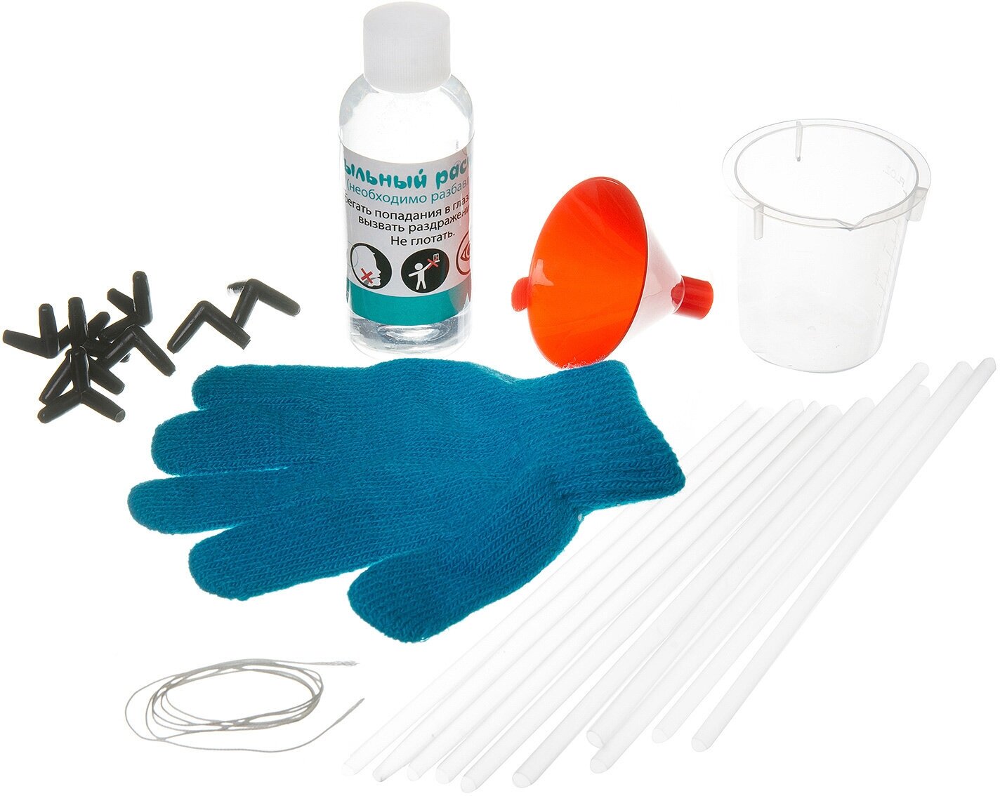 В наборе 60 мл концентрированного мыльного раствора, перчатка, воронка, мерный стакан 50 мл, 10 соломинок, 8 соединительных элементов, леска.