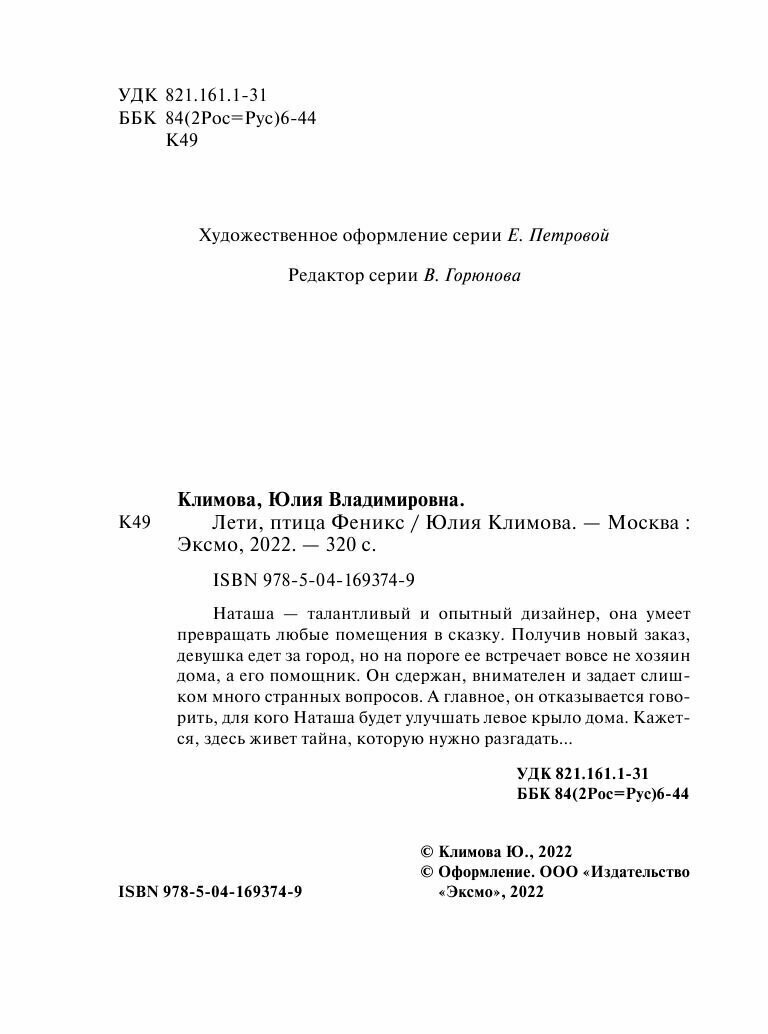 Книга: Лети птица Феникс (Климова Юлия Владимировна); ООО "Издательство "Эксмо", 2022