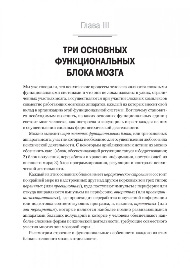 Книга крупнейшего отечественного нейропсихолога Александра Романовича Лурии построена как учебный курс, в котором кратко излагается содержание нейропсихологии как учебной дисциплины. Автор подробно анализирует психологическую структуру и мозговые механизмы отдельных психических процессов - восприятия, произвольных движений и действий, внимания, памяти, речи, мышления. Раскрывает популярную сегодня среди нейропсихологов и клиницистов модель трех основных блоков мозга, в которой реализованы представления автора о целостном характере деятельности мозга при осуществлении психических процессов и об основных типах их нарушений.