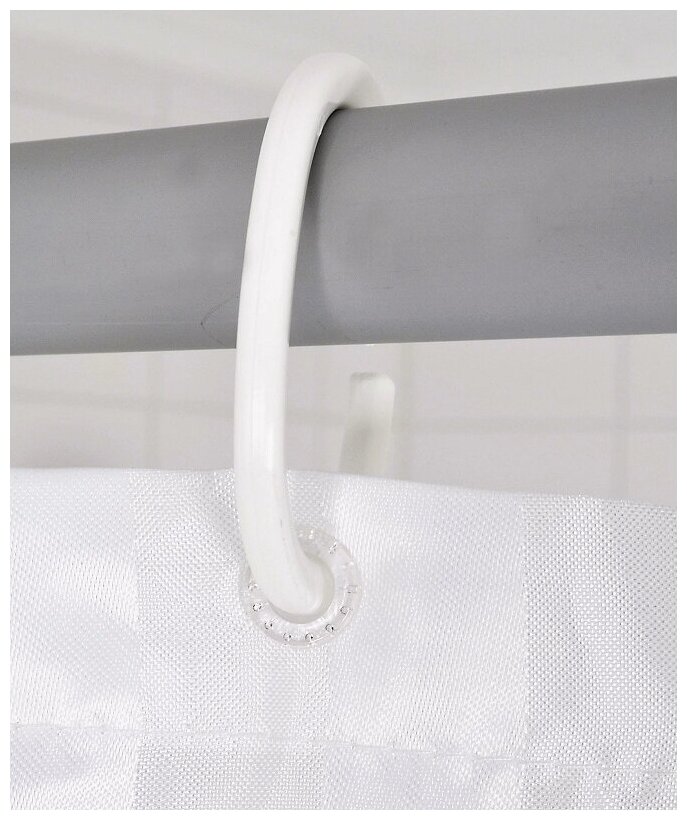 Штора выполнена из 100% гипоаллергенного полиэстера c водоотталкивающей пропиткой. Штора легко крепится на пластиковые кольца (в комплект не входят). Антибактериальная пропитка препятствует появлению грибка и плесени. Качественная обстрочка всех кантов.