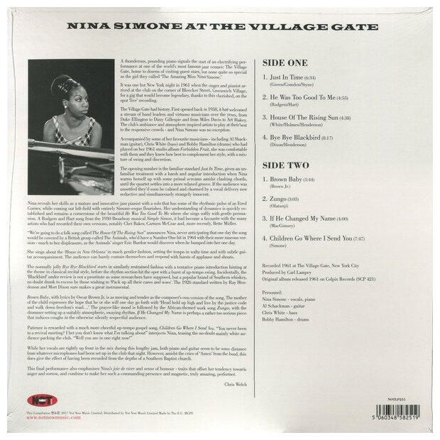 Переиздание на 180-граммовом пурпурном виниле альбома "Nina at the Village Gate" 1962 года, знаменитой американской певицы, пианистки, композитора, аранжировщика, Нины Симон.Nina at the Village Gate — концертный альбом легендарной американской певицы и пианистки Нины Симон, записанный в клубе Village Gate в Гринвич-виллидж, Нью-Йорк в 1961 году.