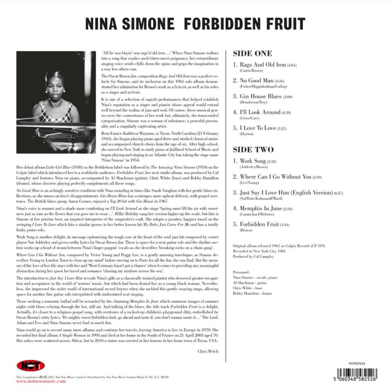 Переиздание на 180-граммовом зеленом виниле альбома "Forbidden Fruit" 1961 года, знаменитой американской певицы, пианистки, композитора, аранжировщика, Нины Симон. "Все, что он покупал, было просто лохмотьями и старым железом." Когда Нина Симон исполняет песню, которая источает такую горько-сладкую остроту, ее необыкновенно поющий голос заставляет пробегать озноб по спине и захватывает воображение так, как мало кто может. Композиция Оскара Брауна "Rags And Old Iron" была идеальным проводником для Симон, и включение трека в этот сольный альбом 1961 года продемонстрировало ее восхищение работой Брауна как автора текстов, а также его ролью певца и активиста. Альбом Forbidden Fruit - это одна из множества превосходных работ, которые помогли установить репутацию Нины как певицы и пианиста, чей творческий гений выходит далеко за рамки джаза и соула. Конечно, эти музыкальные жанры были краеугольными камнями ее творчества, но, в конечном счете, она вышла за рамки категоризации. Симон была содержательной женщиной, сильной личностью и великолепным артистом.