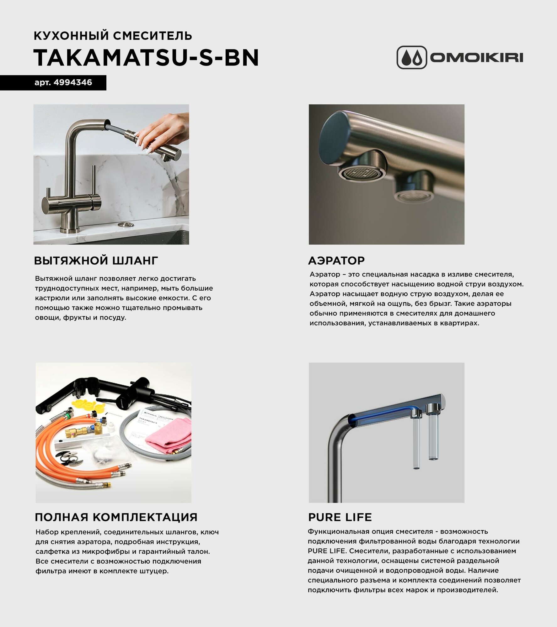 Смеситель для кухни Omoikiri Takamatsu-S-GB . Смеситель Takamatsu-S в категории 3 в 1: функция подачи холодной, горячей воды. Возможность подключения фильтра для очистки и наличие вытяжного шланга. Технология PURE LIFE®: подключение фильтра для очистки воды. Фильтрованная вода подается по отдельной трубке и не смешивается с водопроводной водой. Вытяжной шланг до 400 мм. Гарантия на покрытие - 2 года. Высококачественная латунь без содержания свинца сохранит воду чистой и здоровой. Полный комплект соединений для подключения, инструкция, гарантийный талон.