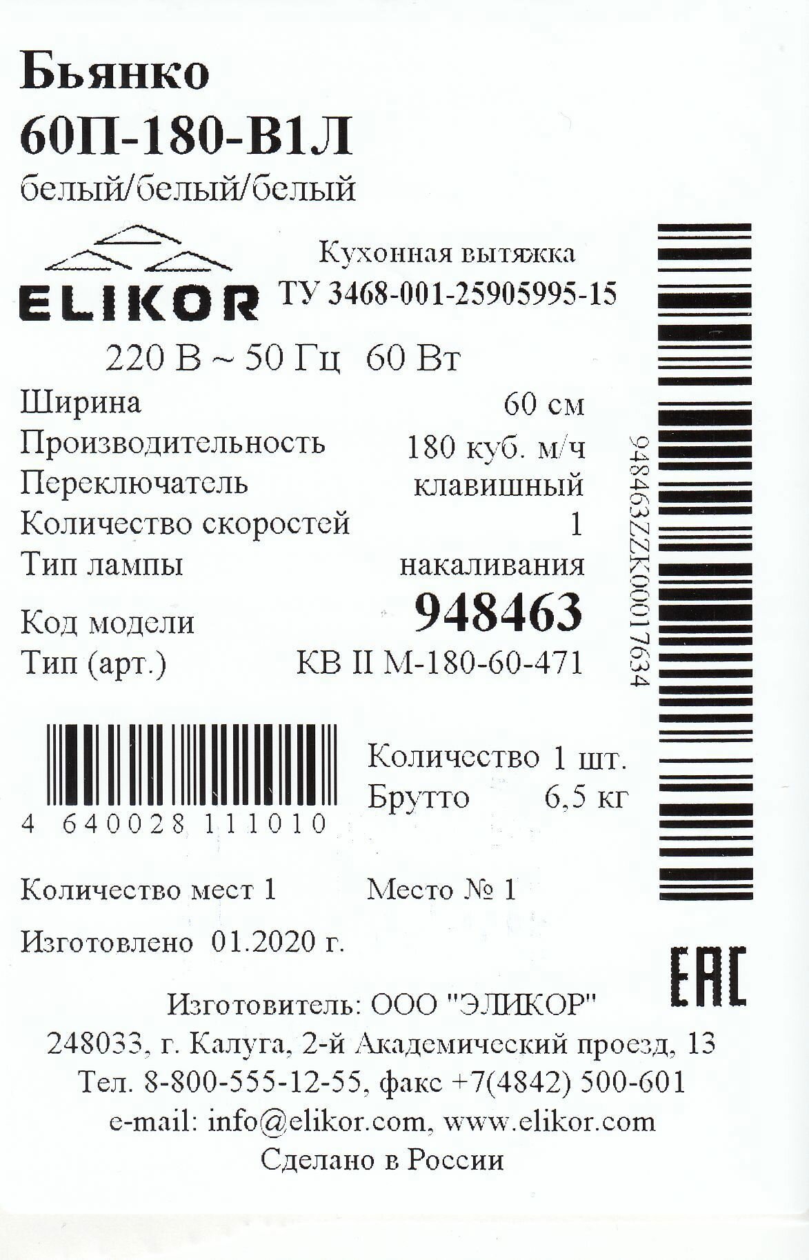 Вытяжка ELIKOR Бьянко 60 см цвет белый