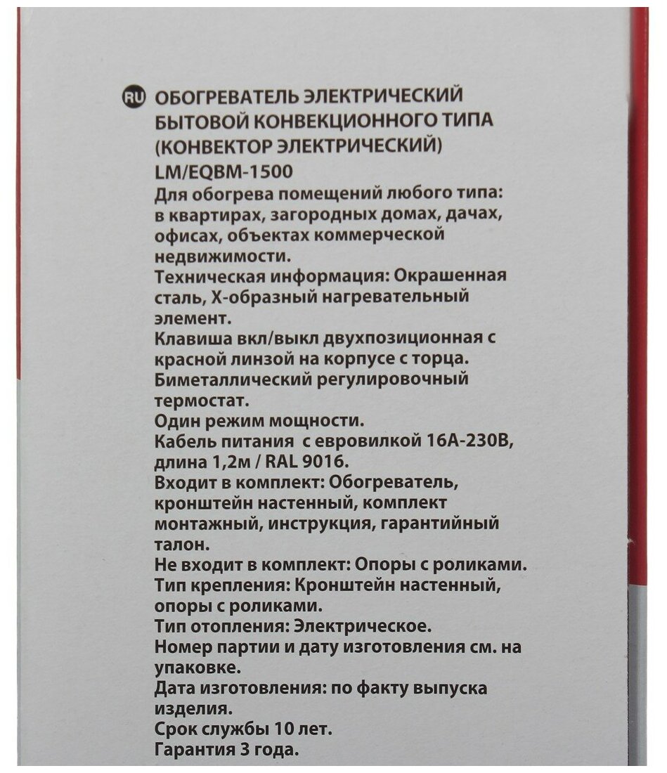 | Состав комплекта | 1. Обогреватель; 2. Кронштейн настенный; 3. Монтажный комплект; 4. Инструкция; 5. Гарантийный талон |