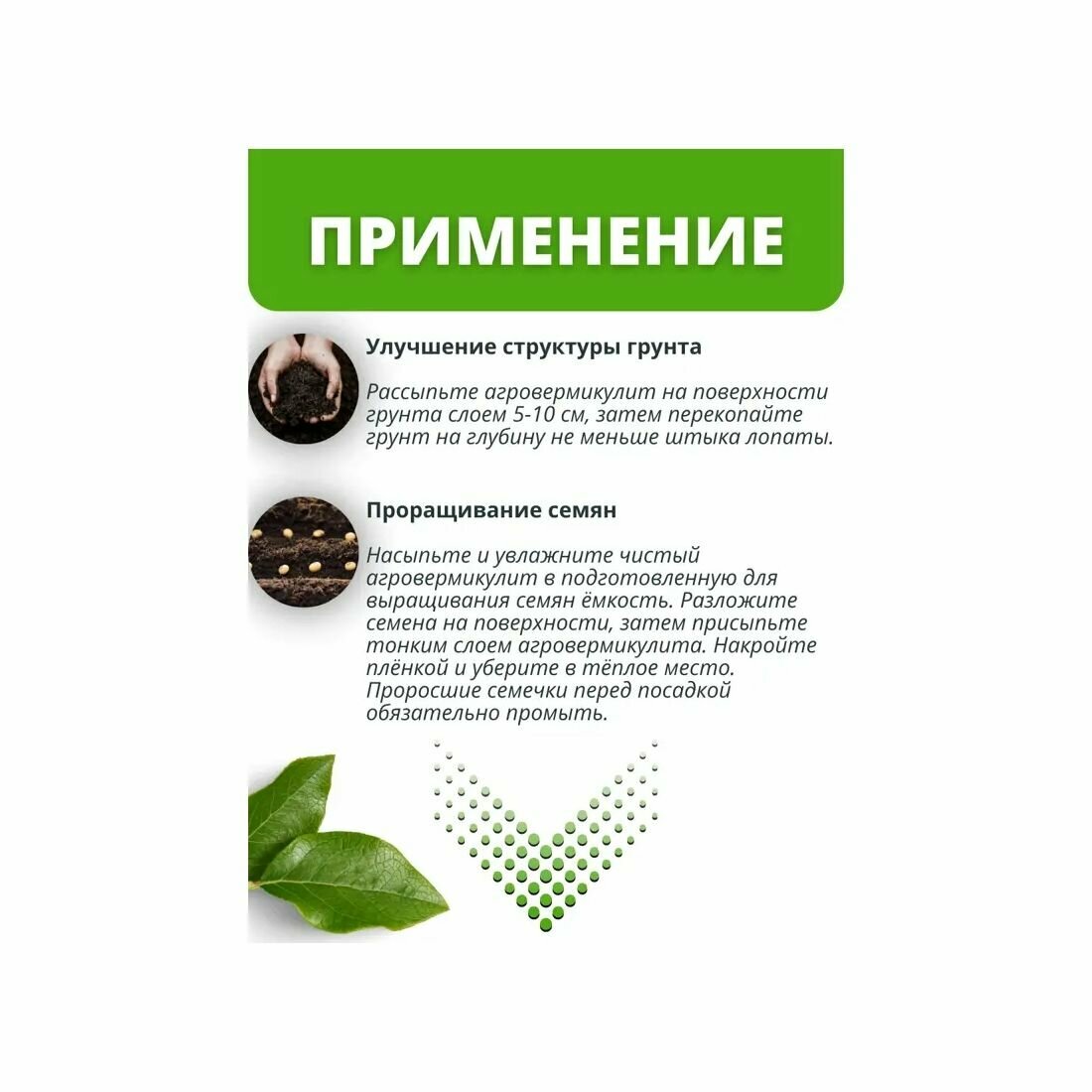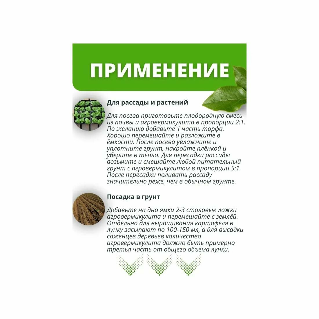 | Способ применения | рассыпать агровермикулит на поверхности грунта слоем 5-10 см, затем перекопайте грунт на глубину не меньше штыка лопаты |
