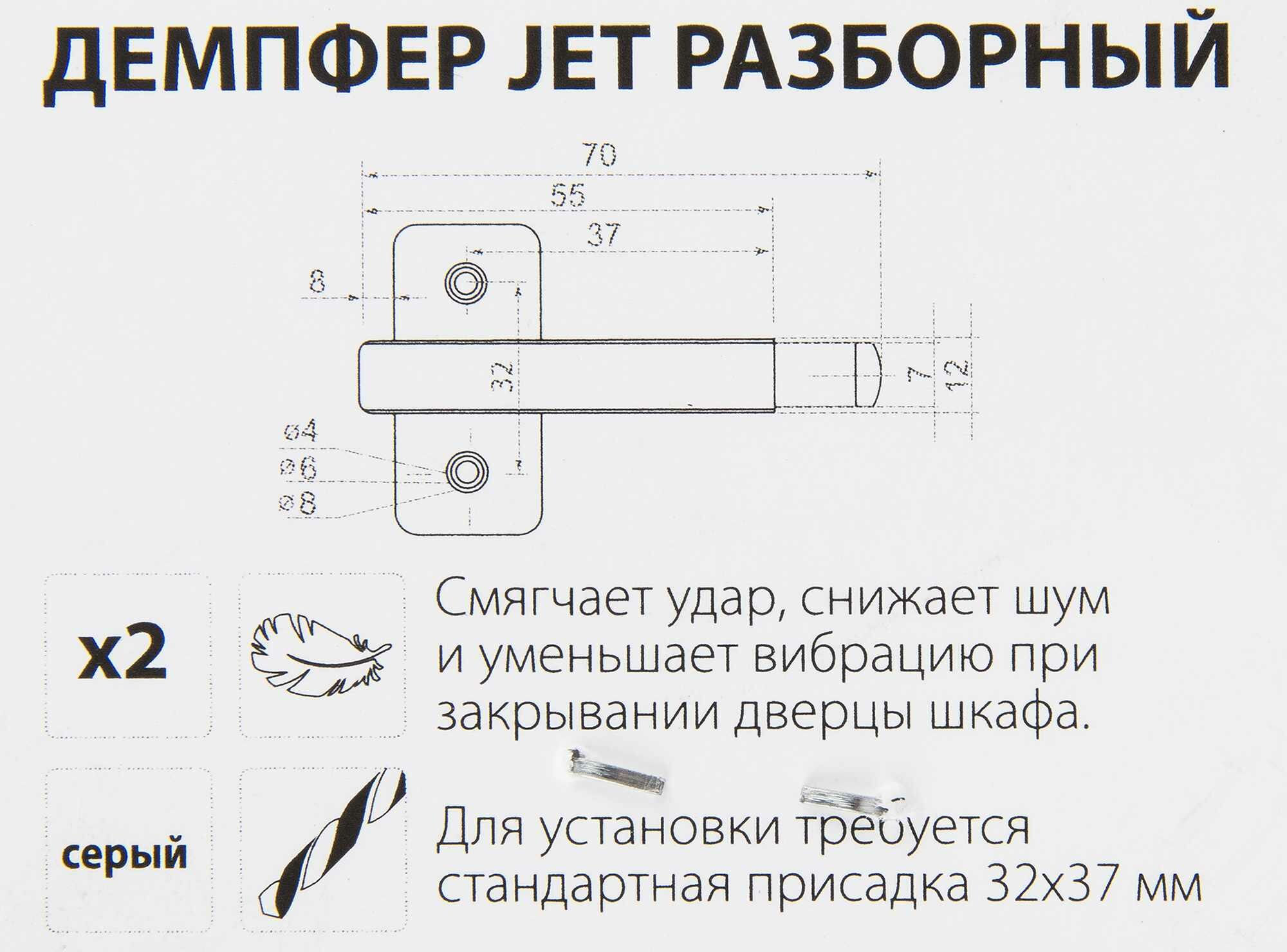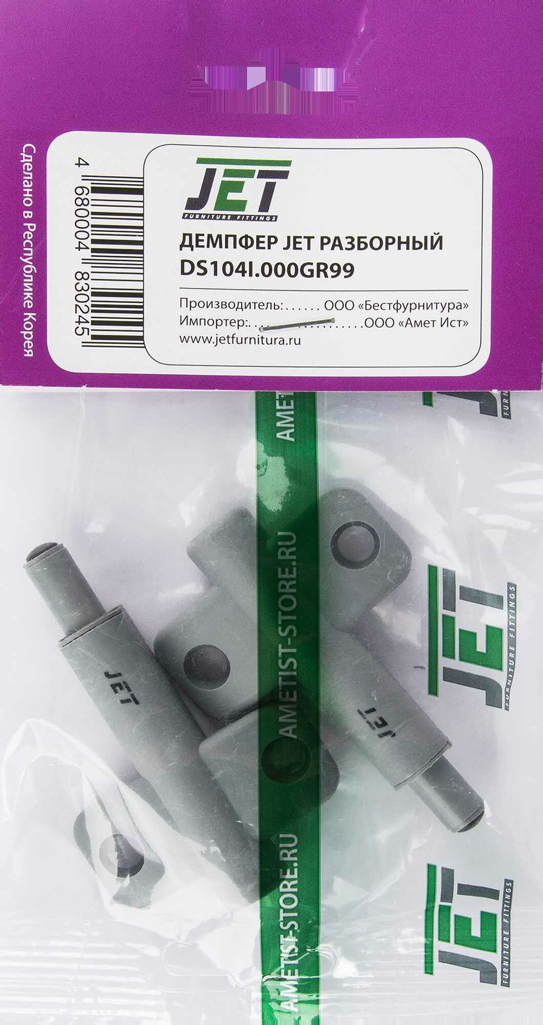 Демпфер разборный серый китайского производства марки JET ? ограничитель удара в мебельных конструкциях. Смягчая удар на дверце, он гарантируют сохранность изделия в целом и отсутствие раздражающих многих пользователей хлопков. Это накладное изделие из пластика серого цвета, крепится к мебели саморезами. Предлагается в наборе из 2 штук.