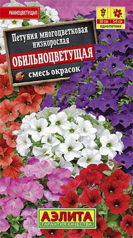 Петуния «Обильноцветущая» смесь окрасок — компактное растение высотой до 30 см. Цветение раннее, обильное. Диаметр цветков — 5-6 см. Смесь состоит из разнообразных цветов. Растение однолетнее, подходит для горшков, рабаток, бордюров, цветников. Цветет с мая до сентября. Устойчиво к засухе, не теряет внешний вид от дождя и ветра.