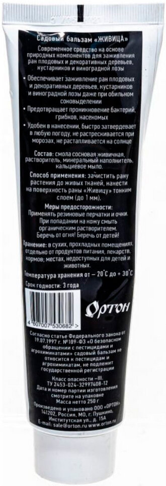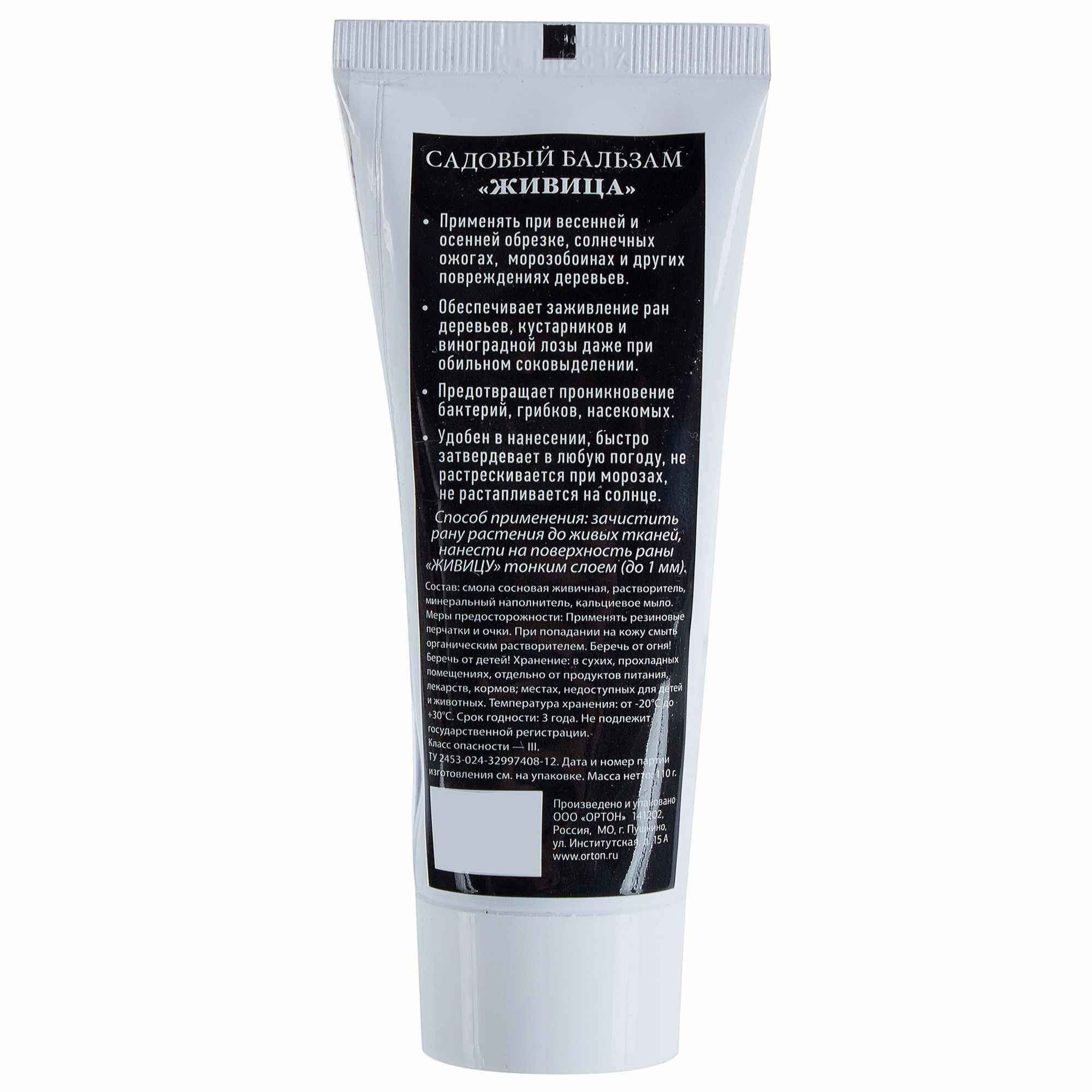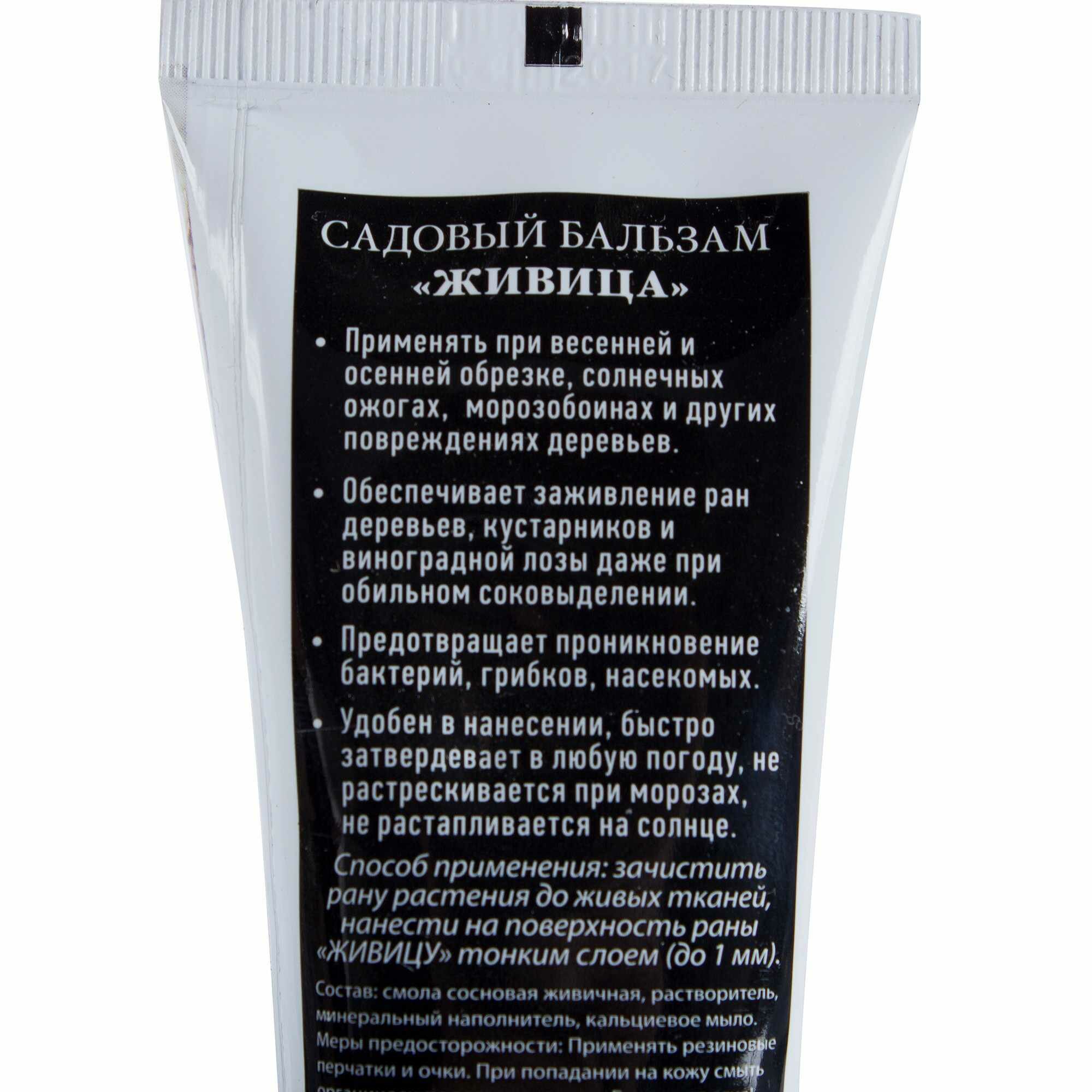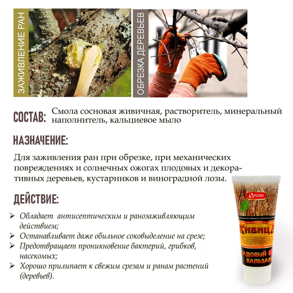 Бальзам садовый «Живица» на основе сосновой смолы используют для заживления повреждений на деревьях, виноградной лозе, кустарниках после обрезки, солнечных ожогов, обморожений. Не допускает заражения бактериями, вредителями, насекомыми и грибком. Быстро твердеет, зимой при низкой температуре не скалывается, на солнце не тает.