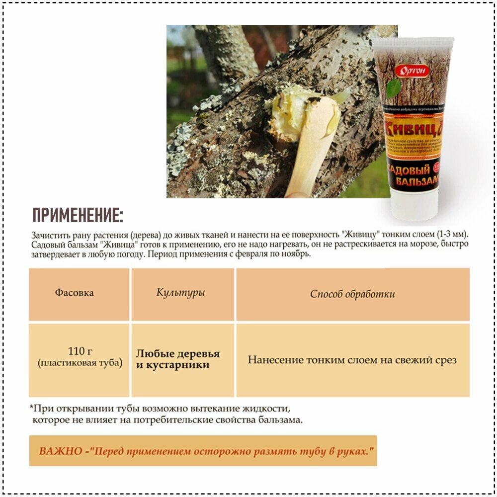 Зачистить рану растения до живых тканей и нанести на ее поверхность «Живицу» тонким слоем (1-3 мм). Садовый бальзам «Живица» готов к применению, нужно только размять трубу в руках.