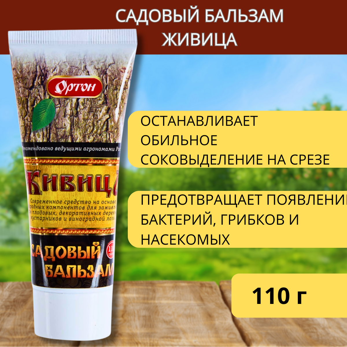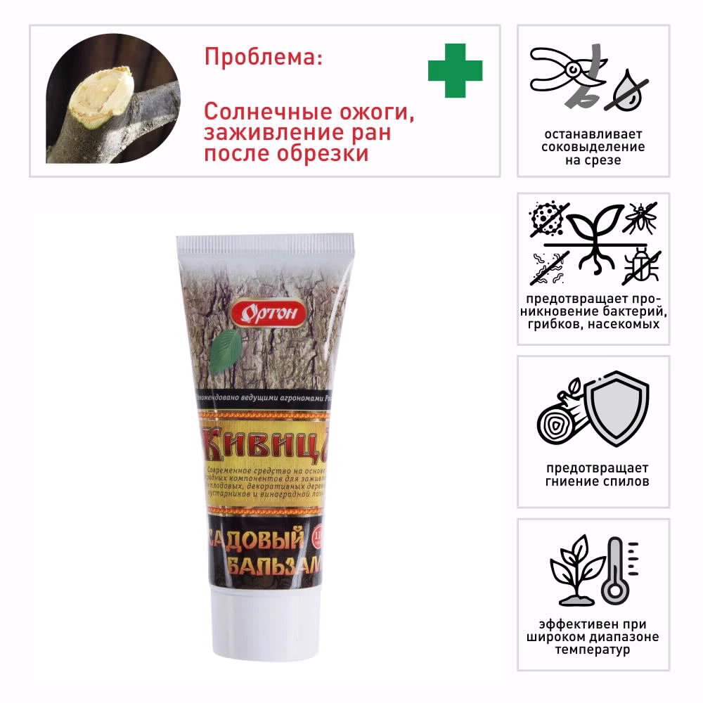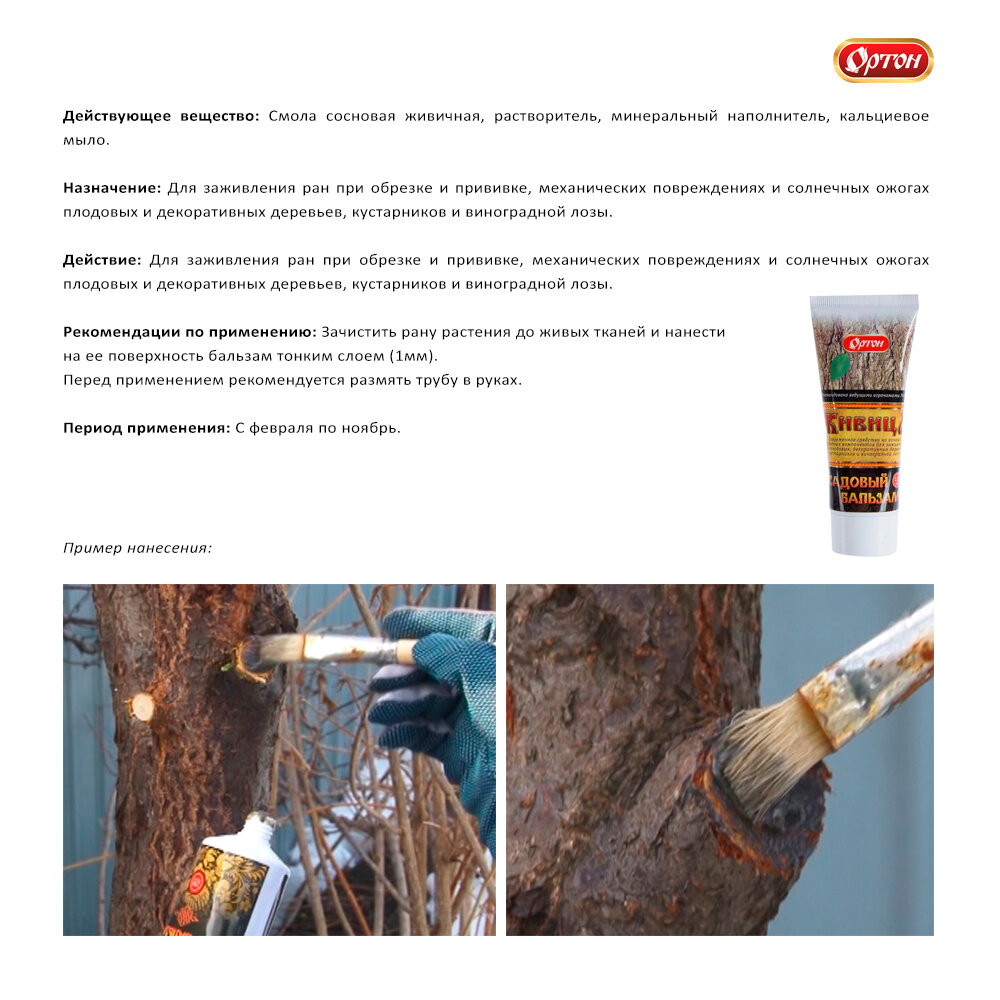 Садовый бальзам для заживления ран при обрезке и прививке, механических повреждениях и солнечных ожогах плодовых и декоративных деревьев, кустарников и виноградной лозы.