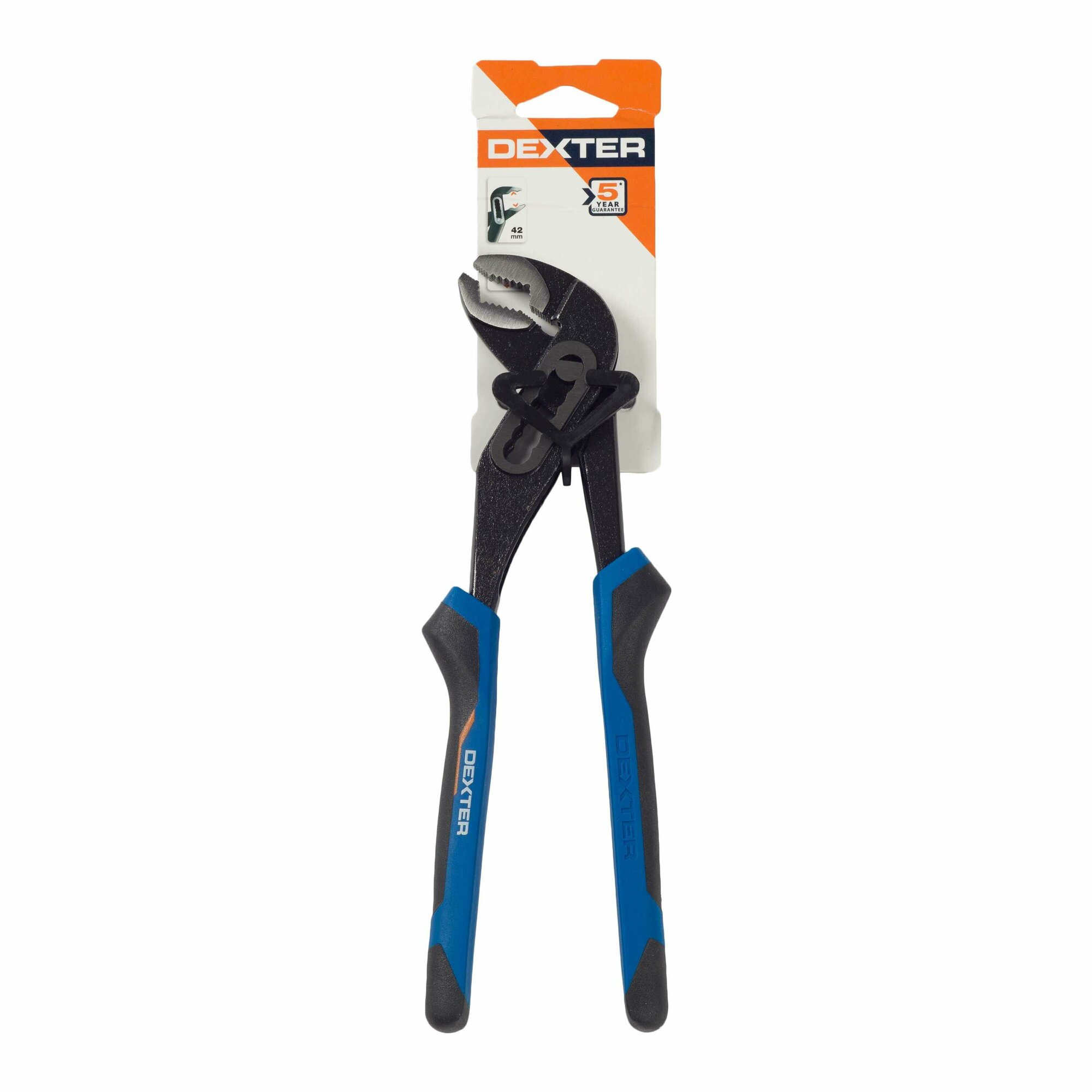 Клещи переставные Dexter — ручной механический инструмент для удерживания стальных труб, затягивания или раскручивания болтов, работы с крепежом. Принцип действия ключа основан на шарнирном механизме, который устанавливается в одну из семи позиций. Расстояние между губками регулируется с учетом размера фитинга или диаметра трубы. Рабочая часть выполнена из прочной хромованадиевой стали, устойчивой к коррозии, при выполнении работ перемещается вдоль детали и фиксирует ее.