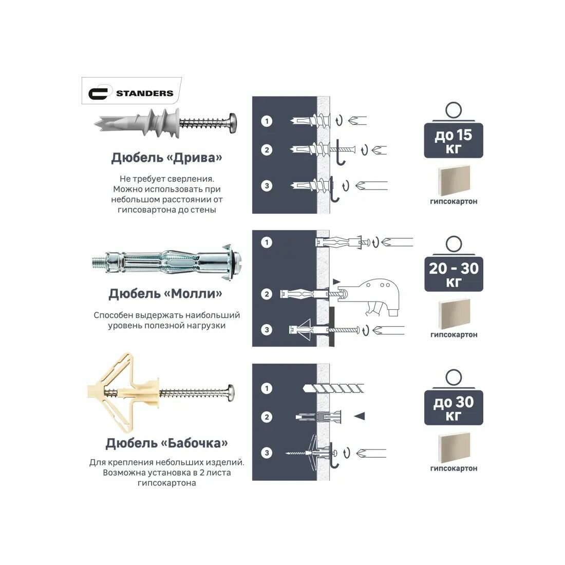 Дюбель с винтом Молли STANDERS — специальный вид крепежа, разработанный для работы с гипсокартоном, листами ДСП, блоками из пенобетона и другими пустотелыми материалами.