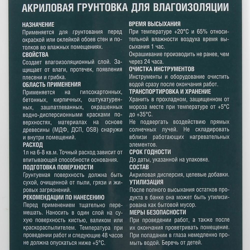 Грунт выпускается в емкости вместимостью 0,9 л. Подсчет необходимого количества грунта для обработки помещения проводится с учетом показателей производительности: 1 л на 6-8 м². Инструменты после работы можно очищать с помощью воды. Товар произведен в России. Срок годности грунтующего раствора составляет 18 месяцев.