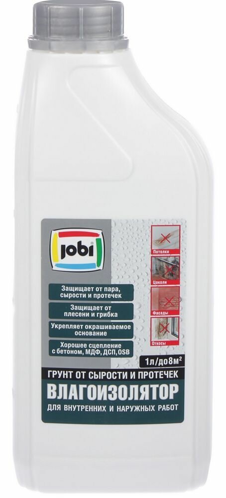 Грунт-влагоизолятор Jobi ― белый жидкий раствор, предназначенный для предварительной подготовки поверхностей перед нанесением краски. Подходит для оснований из бетона, МДФ, ДСП, OSB. Главное достоинство этого защитного средства в том, что оно подходит для использования в помещениях с повышенной влажностью, например, в ванной или на кухне. Рассчитано на подготовку поверхности площадью 8 м².
