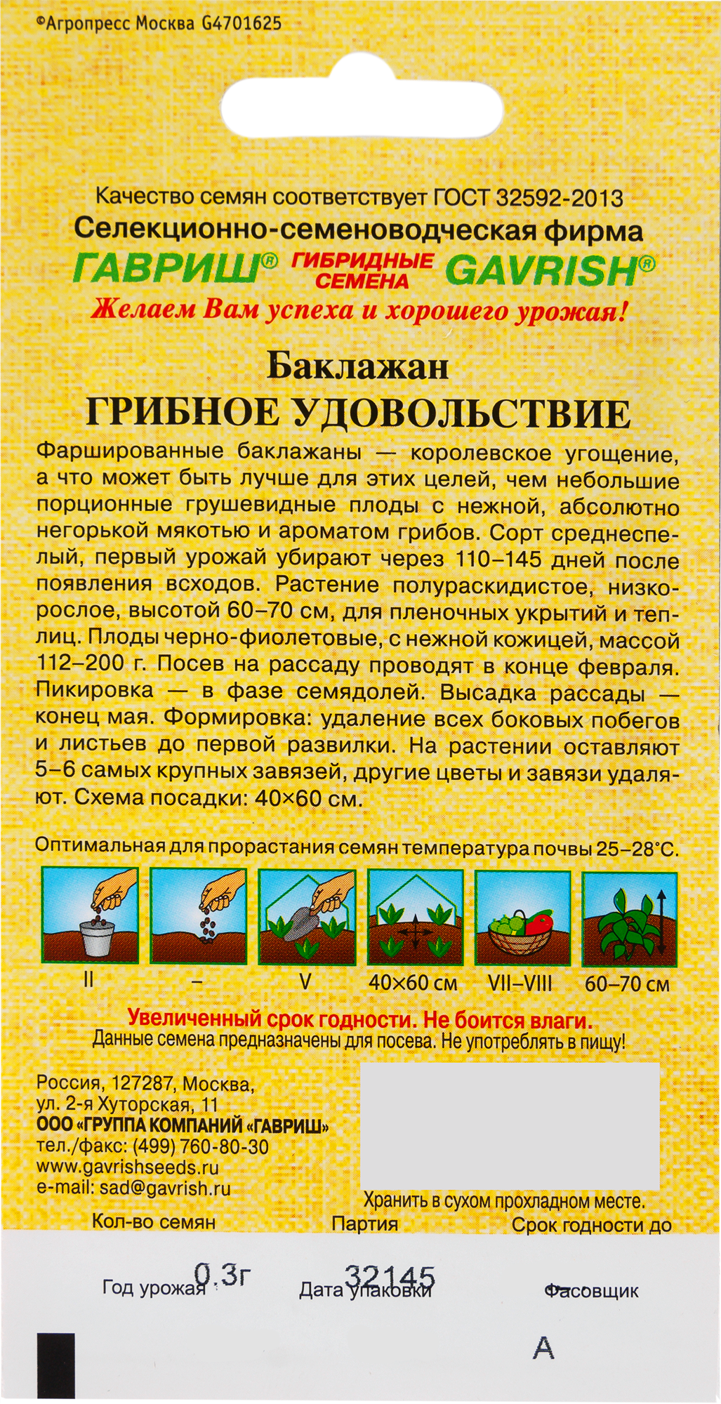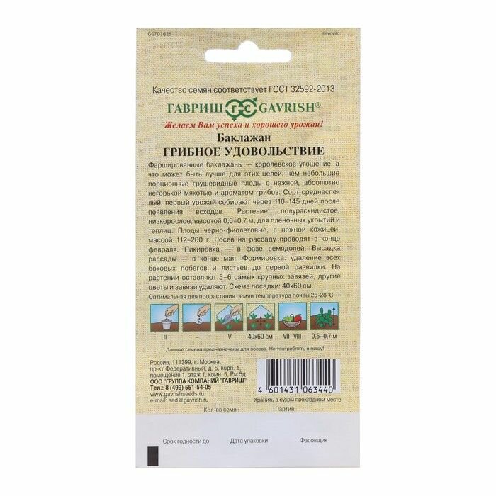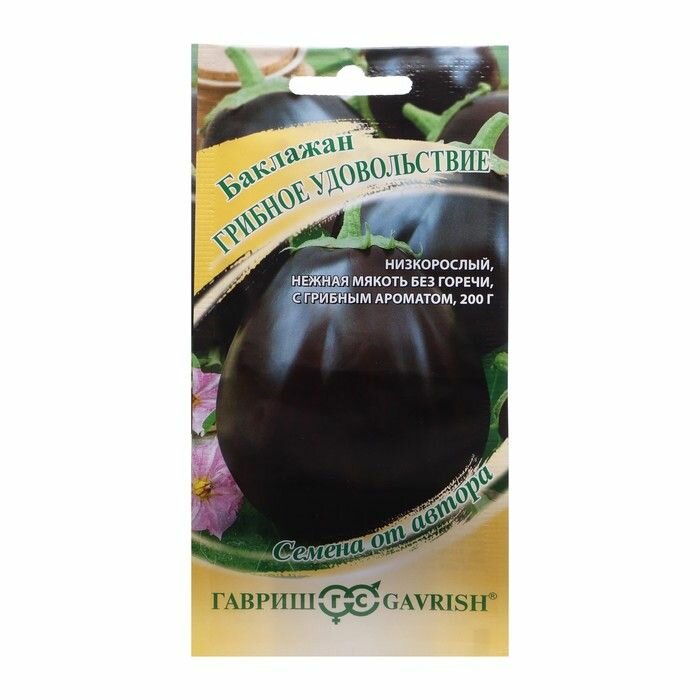 Баклажан «Грибное удовольствие» — сорт, относящийся к среднеспелым (от всходов до сбора урожая — 110-145 дней), подходит для выращивания в пленочных укрытиях и теплицах. Куст полураскидистый, низкорослый (до 70 см). Дает небольшие грушевидные плоды весом до 200 г. Кожица тонкая, черно-фиолетовая, мякоть светлая, без горечи, с характерным грибным ароматом. Под пленкой урожайность достигает 7,8 кг/м².