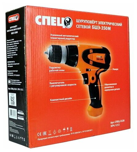 Шуруповерт «Спец» БШЭ-350М работает от электрической сети: подключается к ней при помощи сетевого кабеля длиной 1,8 м. Электродвигатель мощностью 350 Вт позволяет инструменту развивать крутящий момент до 25 Н*м. Частота вращения на холостом ходу составляет 800 об/мин. Компактные габариты, вес 1,35 кг и резиновые накладки на ручке и корпусе облегчают манипуляции с инструментом.