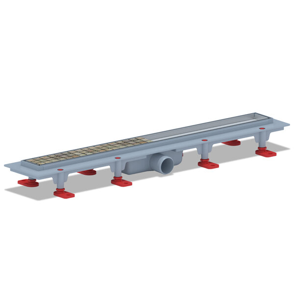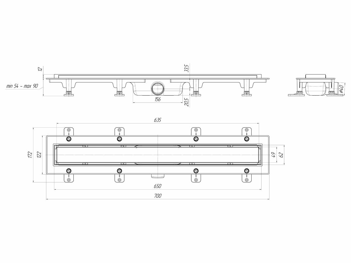 Габариты трапа 12,2х70 см (ШхД). Внутри корпуса установлен сифон. Слив горизонтальный, диаметр выпуска 40 мм. Пропускная способность — 30 л/мин. Сверху трап закрывает прямоугольная решетка, которая задерживает мусор, препятствуя забиванию слива, а также выполняет декоративную функцию. На решетку можно становиться, принимая душ: изделие выдерживает нагрузку до 300 кг.