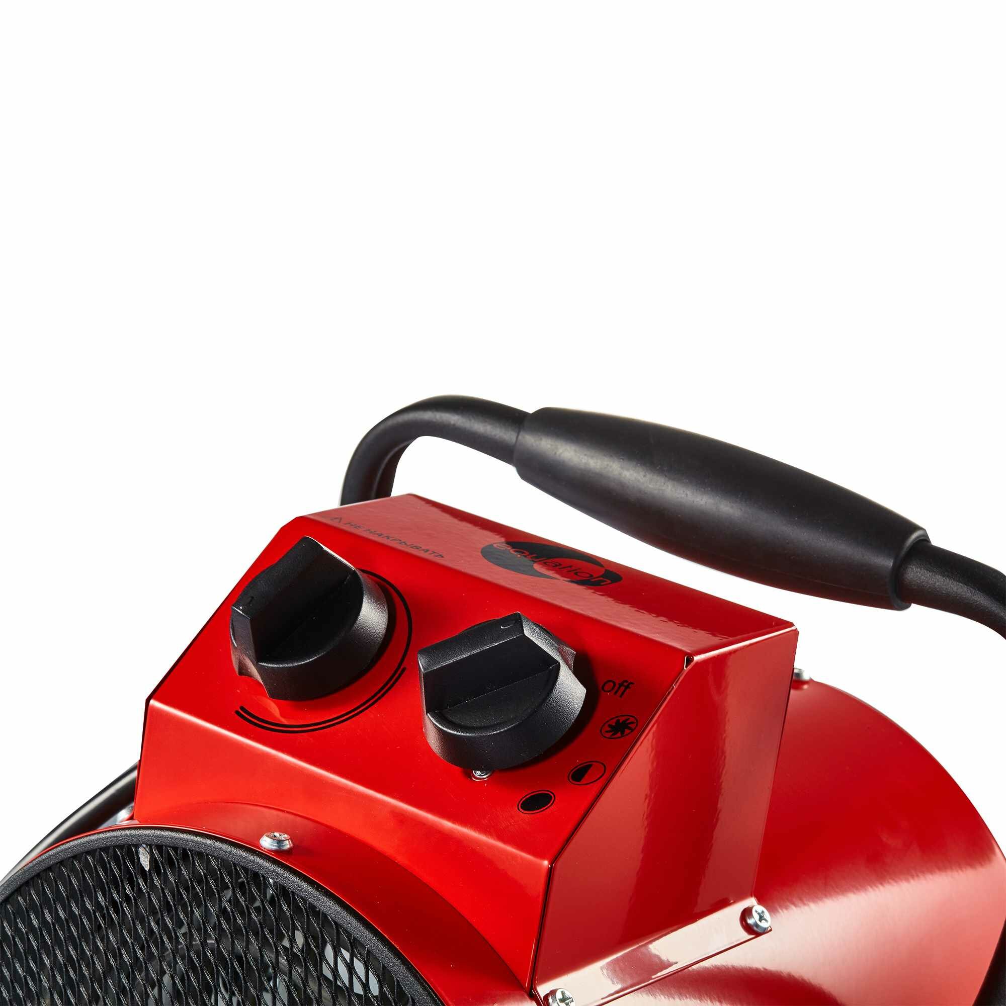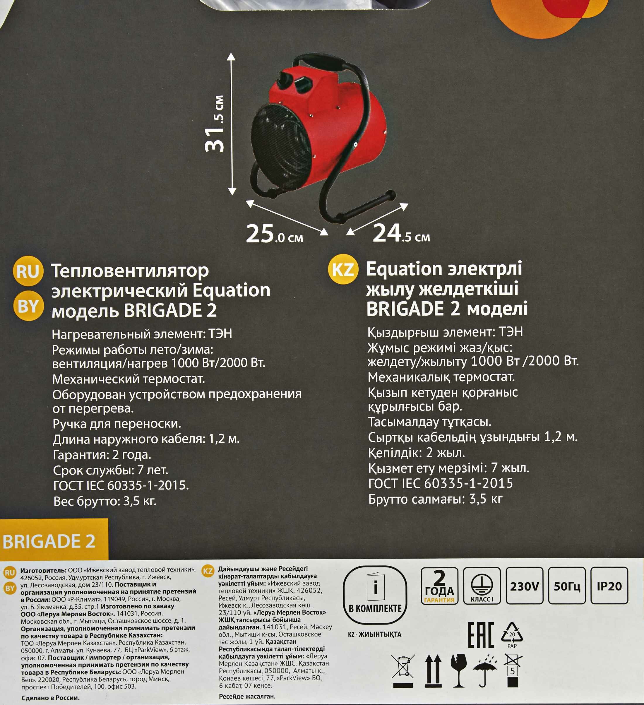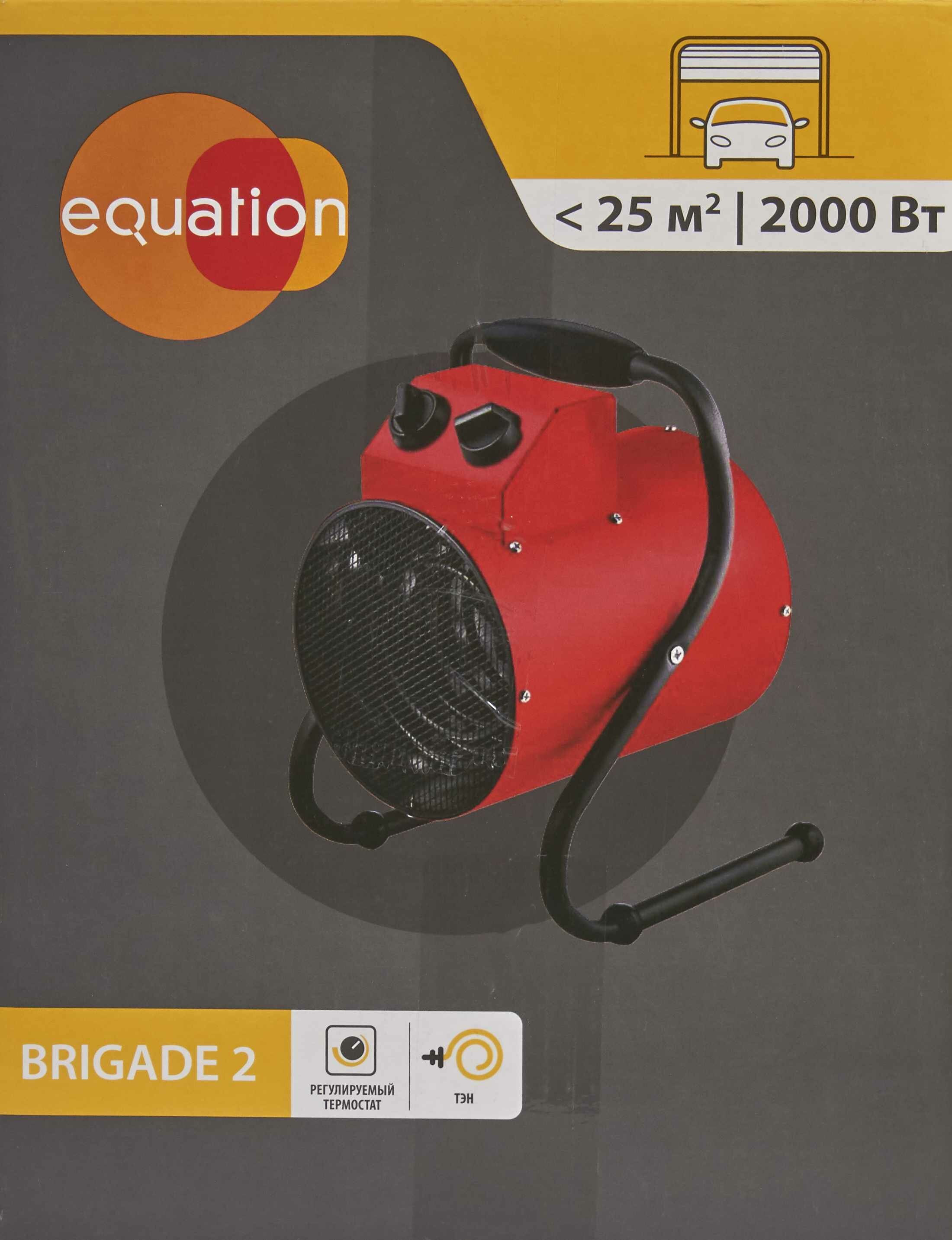 Пушка тепловая Equation Brigade 2 — это электрическое нагревательное устройство, представляющее собой мощный тепловентилятор, помещенный внутрь стального корпуса красного цвета. Прибор создает направленный тепловой поток, предназначен для обогрева жилых и нежилых помещений, а также для просушки поверхностей и предметов. В качестве нагревающего элемента используется ТЭН, обдуваемый потоком воздуха.