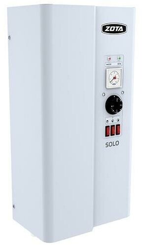 **Котёл электрический Zota-6** предназначен для установки на стену. Модель одноконтурная, используется для отопления помещений площадью 30 м². Также применяется для организации горячего водоснабжения. На корпусе расположен жидкокристаллический дисплей, отражающий данные о работе устройства. Модель оснащена защитой от перегрева, протечек, включения воды, замерзания. Управление механическое.