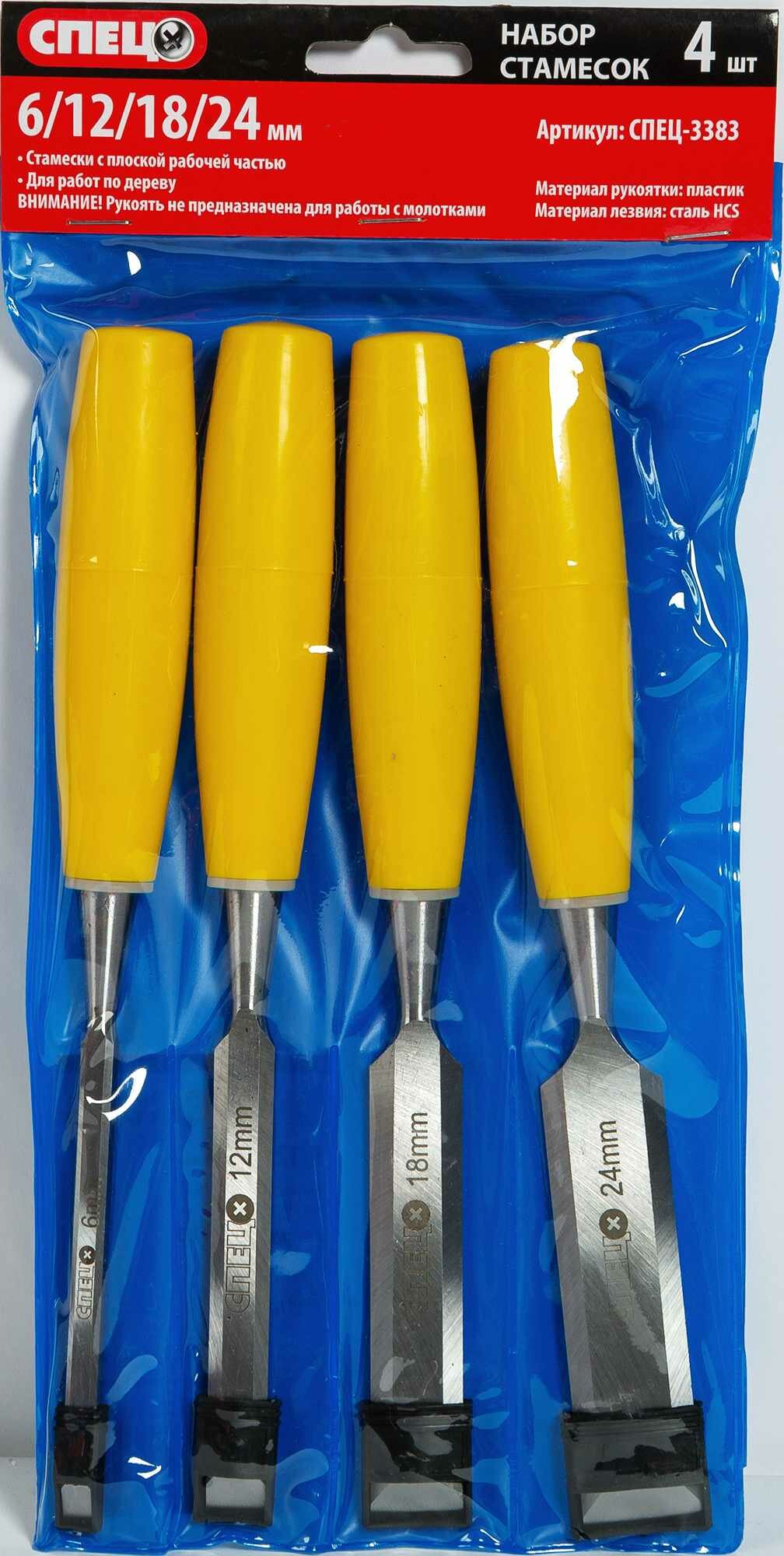| Наименование модели | набор стамесок НС-4П, пласт.рукоять, 4 шт,6-12-18-24мм,сталь HCS,пласт пакет 3383 СПЕЦ-3383 |