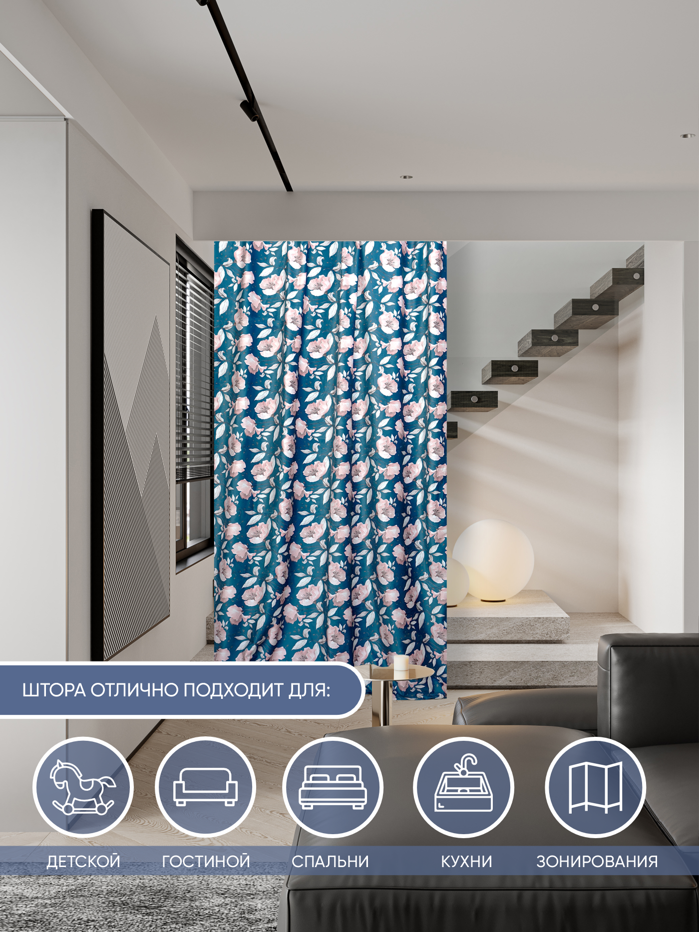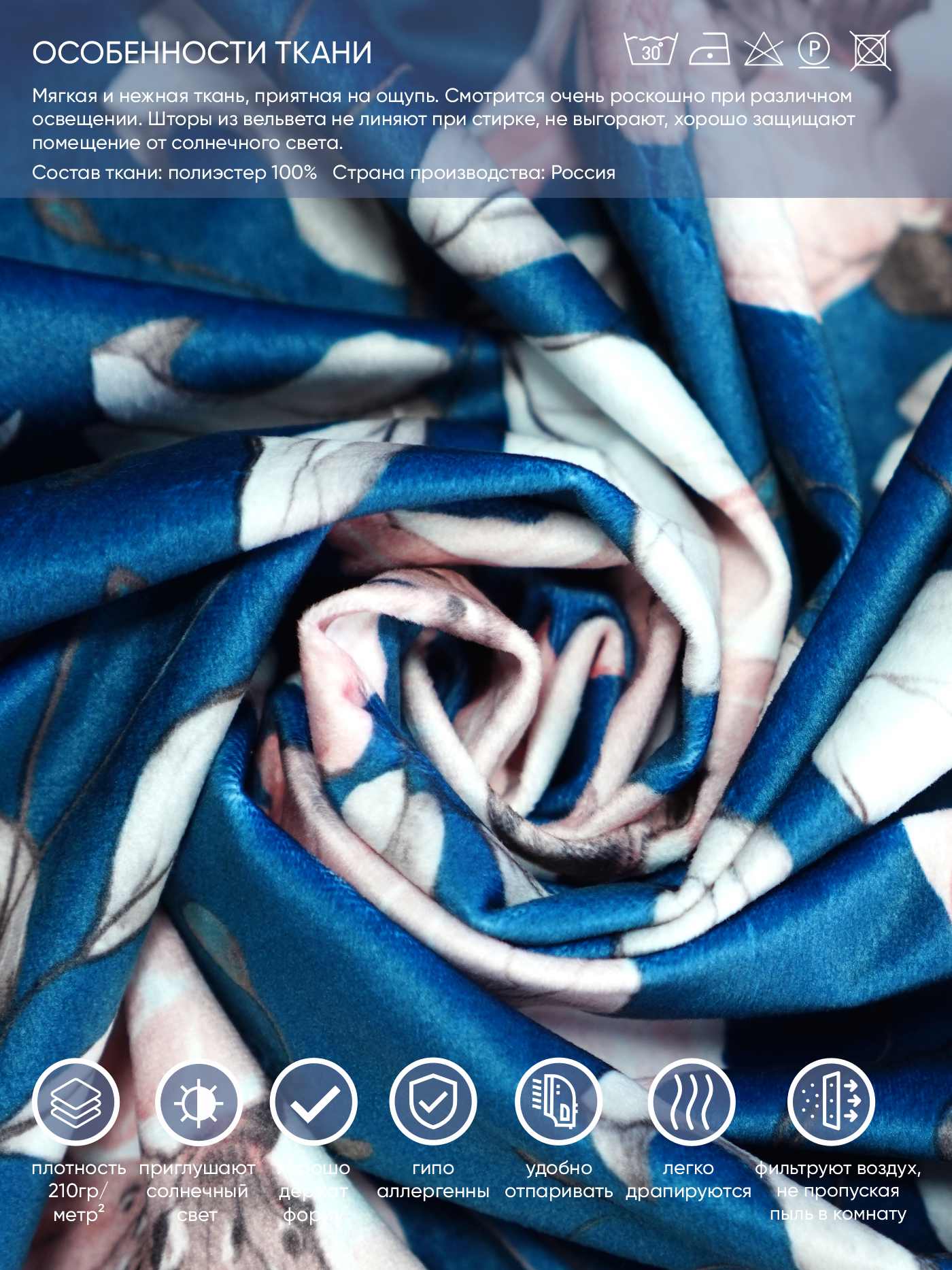 Штора изготовлена из 100% полиэстера. Материал с вельветовой текстурой отличается высокой прочностью и устойчивостью к выгоранию, не впитывает запахи и не накапливает пыль. Занавески хорошо драпируются, ниспадая мягкими волнами, и прекрасно держат форму. Цвет материала — синий.