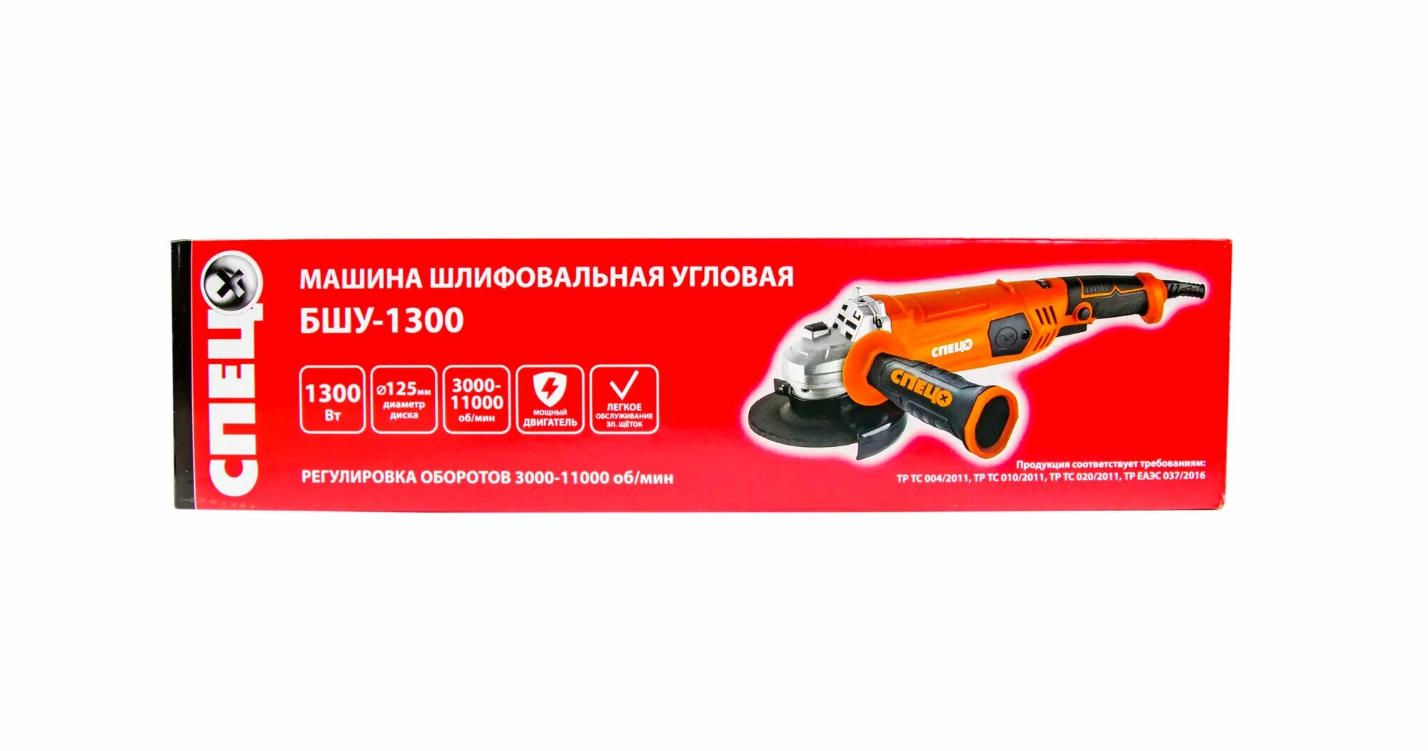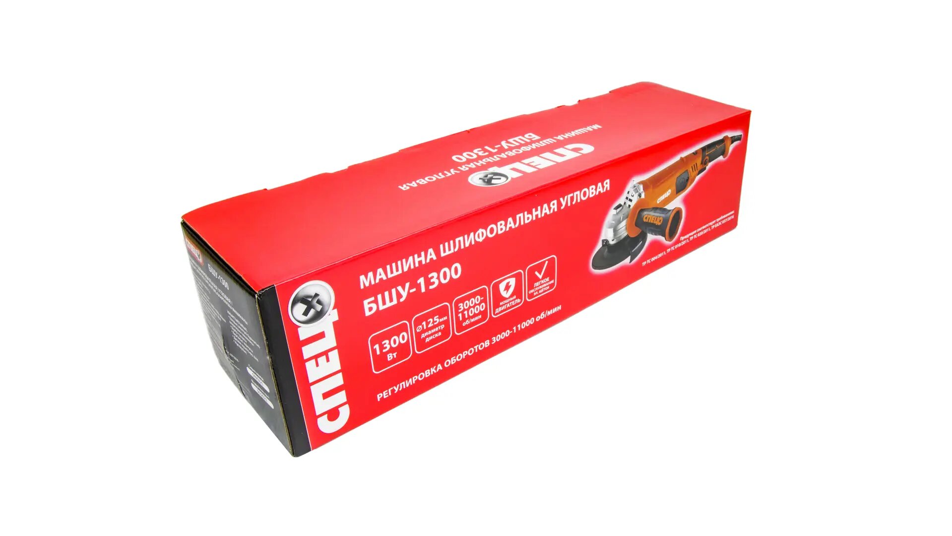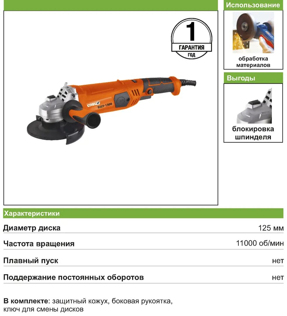 УШМ (болгарка) Спец БШУ-1300 — бытовая угловая шлифовальная машина мощностью 1300 Вт. Подходит для домашних ремонтных работ и резки металла. Машина имеет регулятор оборотов до 11 тыс. об/мин. Вес инструмента — 2 кг.