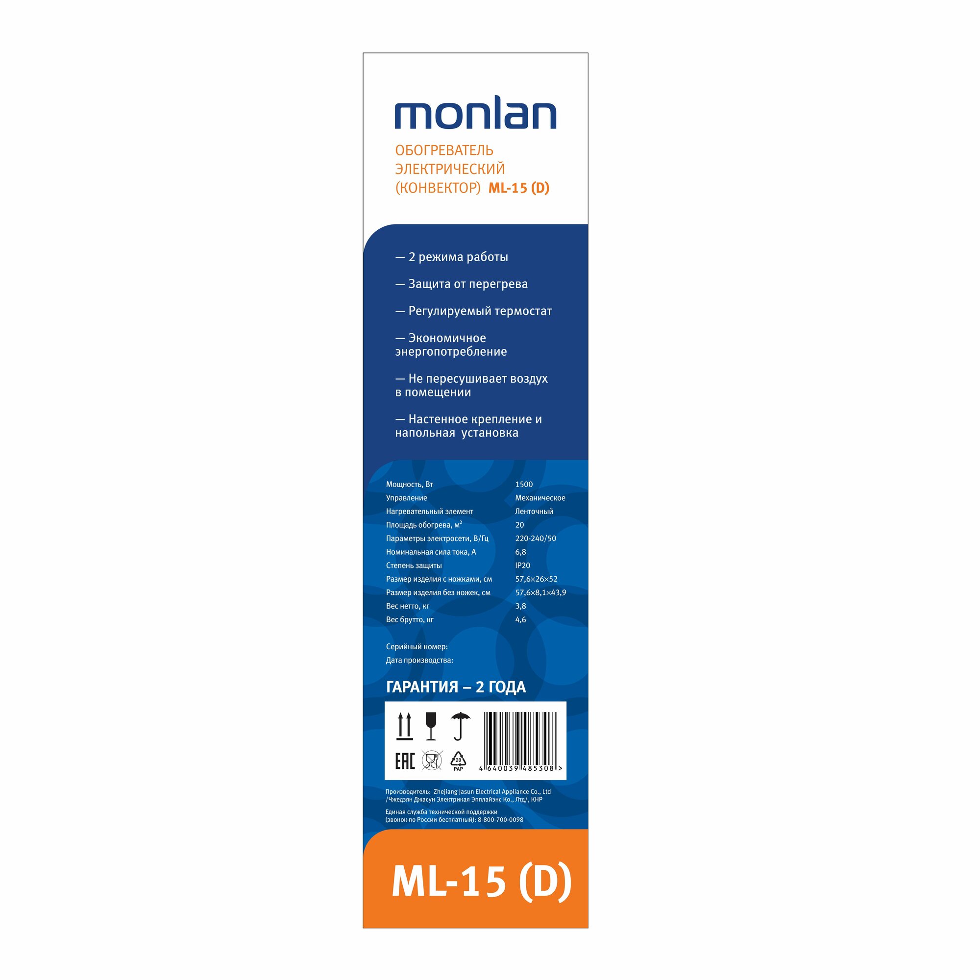 Ленточный конвектор Monlan ML-15 – это высокоэффективный электроприбор, предназначенный для обогрева помещений при помощи нагревательного стич-элемента. Встроенные регулятор режимов работы и удобный термостат помогают быстро прогреть комнату или целый дом за счёт естественной конвекции. Идущие в комплекте роликовые колёса делают прибор мобильным, а с помощью крепёжных элементов конвектор Monlan можно смонтировать на стену, сэкономив полезное место. Наличие встроенной защиты от перегрева, степени защиты IP20 и бережное отношение к влажности воздуха делают конвектор Monlan безопасным и комфортным в использовании.