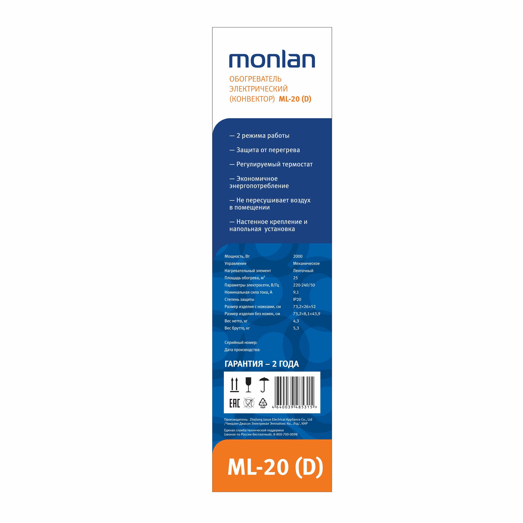 Ленточный конвектор Monlan ML-20 – это высокоэффективный электроприбор, предназначенный для обогрева помещений при помощи нагревательного стич-элемента. Встроенные регулятор режимов работы и удобный термостат помогают быстро прогреть комнату или целый дом за счёт естественной конвекции. Идущие в комплекте роликовые колёса делают прибор мобильным, а с помощью крепёжных элементов конвектор Monlan можно смонтировать на стену, сэкономив полезное место. Наличие встроенной защиты от перегрева, степени защиты IP20 и бережное отношение к влажности воздуха делают конвектор Monlan безопасным и комфортным в использовании.