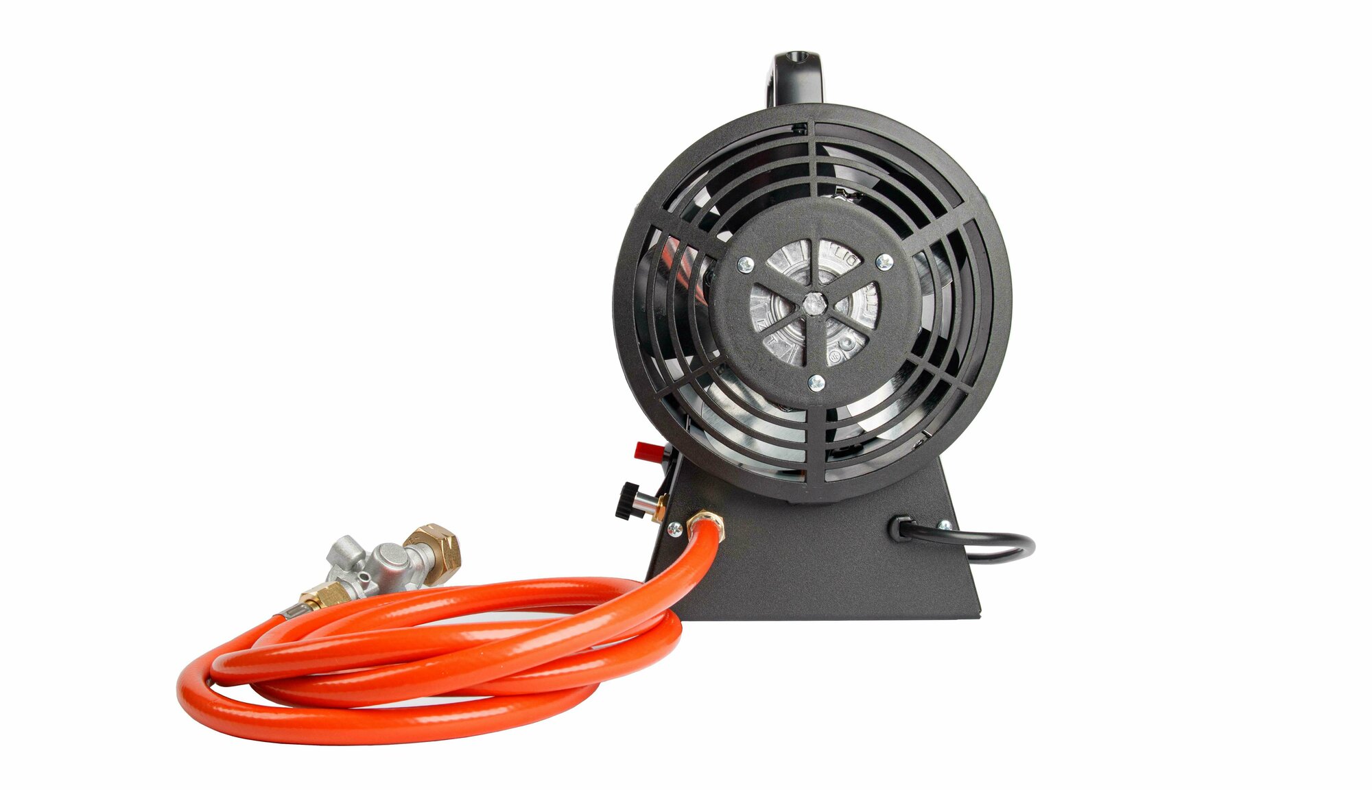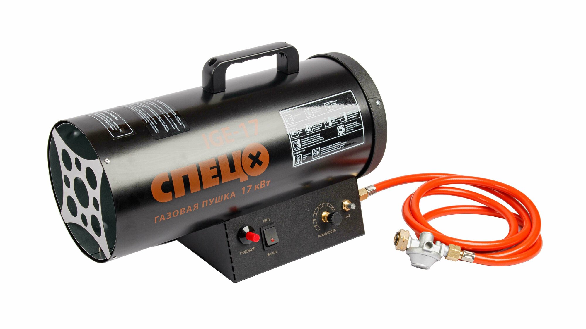 Газовый редуктор и шланг поставляются в комплекте с тепловой пушкой, поэтому никаких дополнительных материалов для подключения и запуска не требуется — достаточно только присоединить к устройству газовый баллон гаечным ключом.