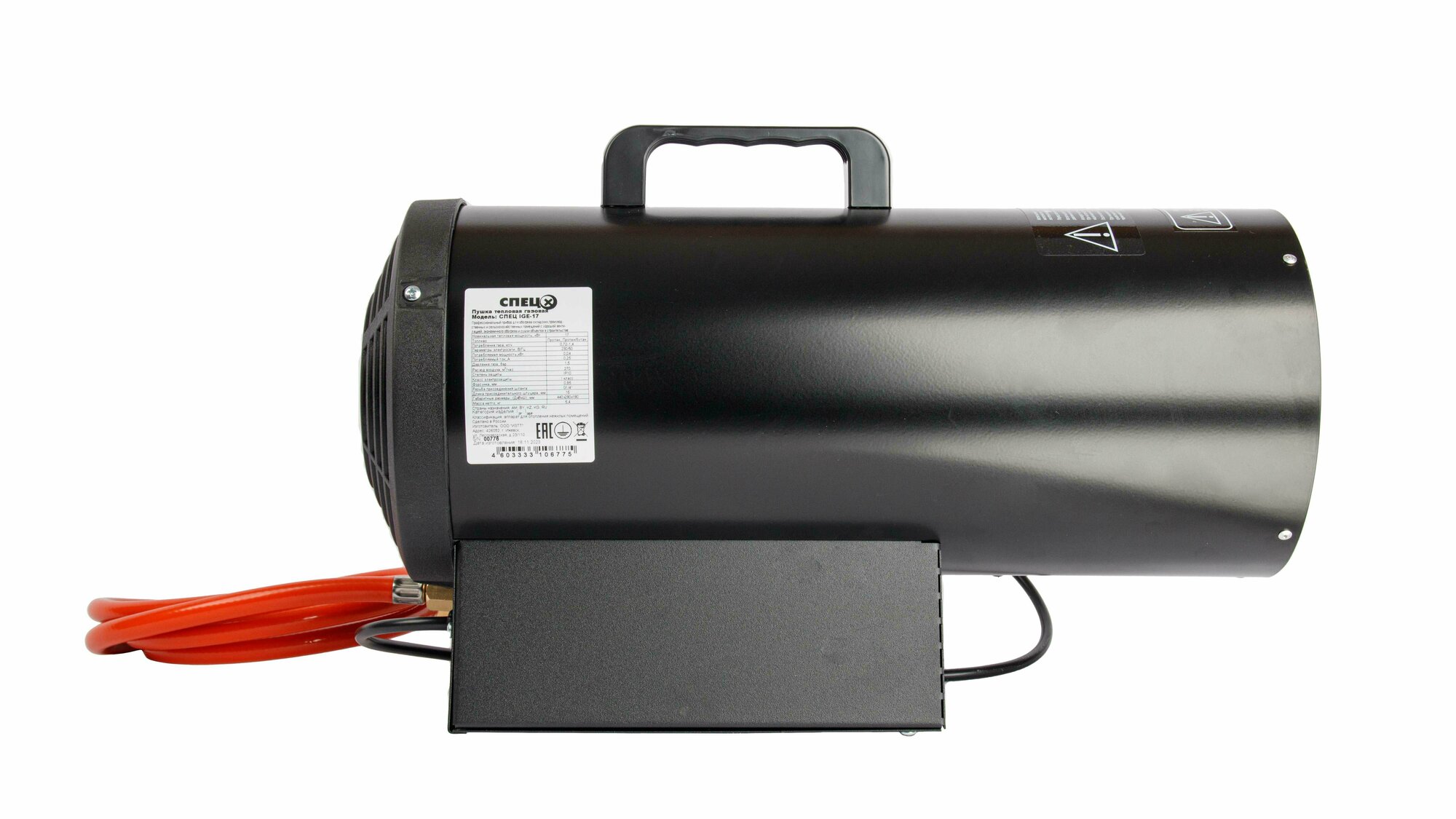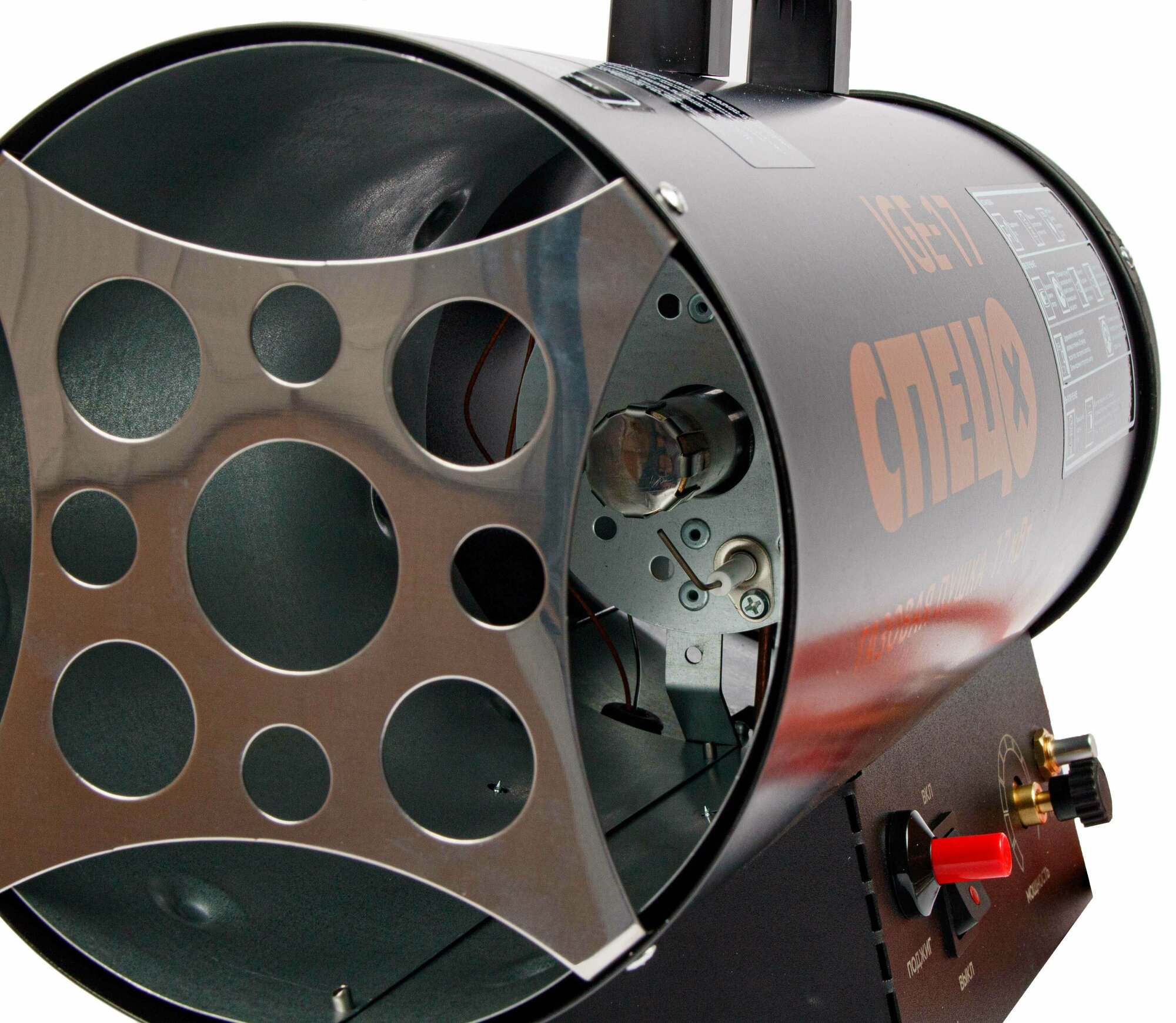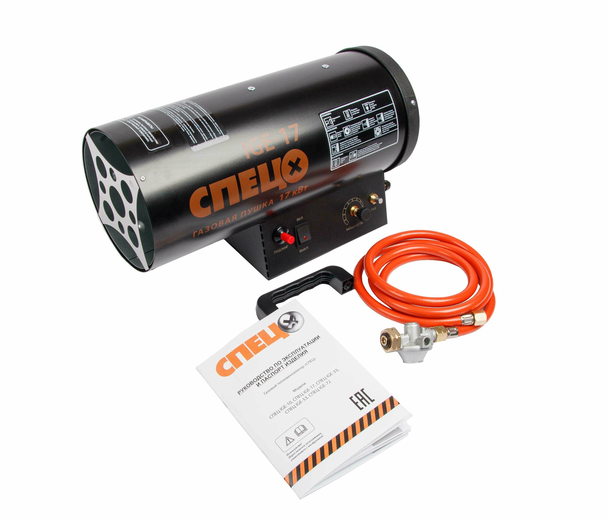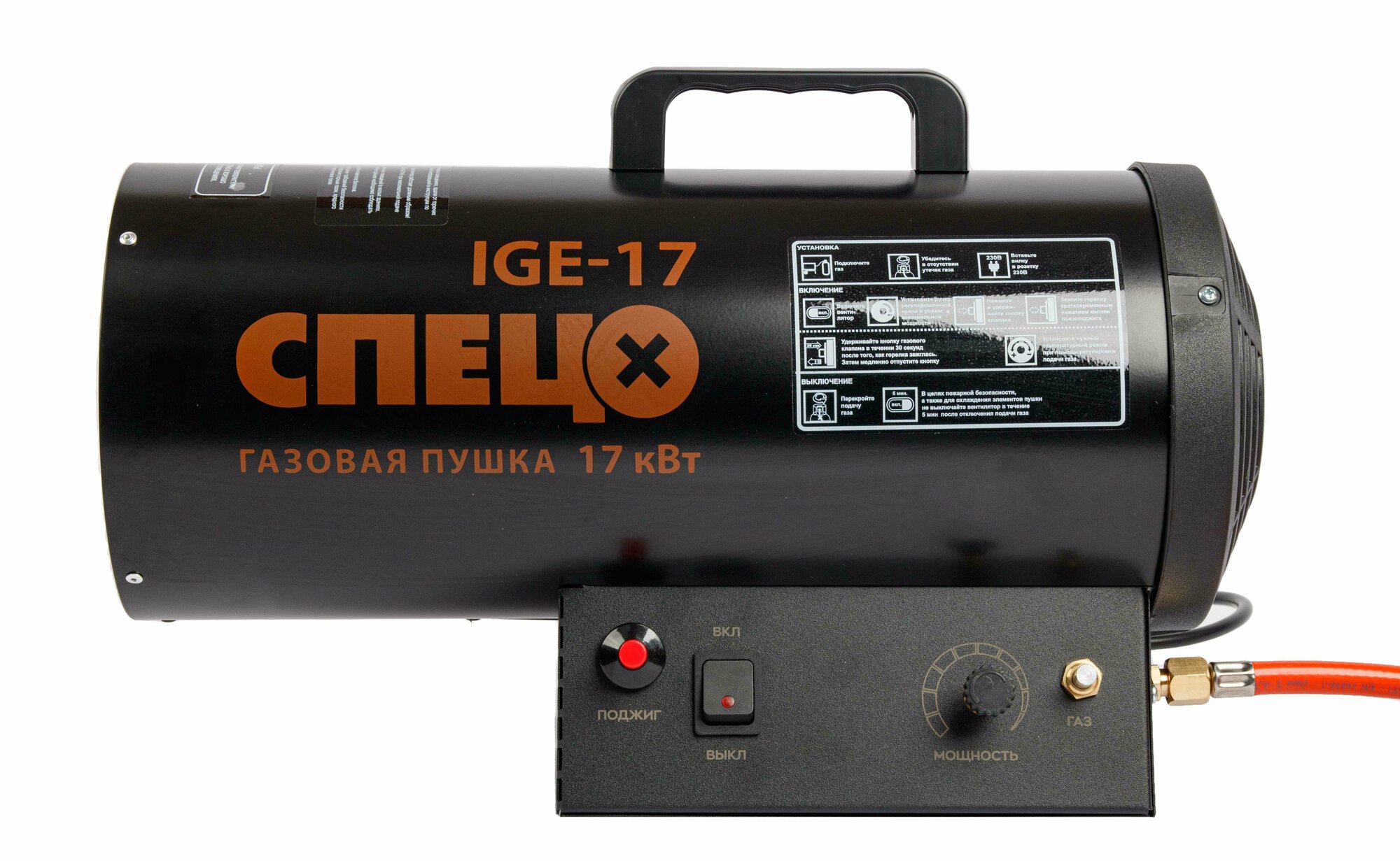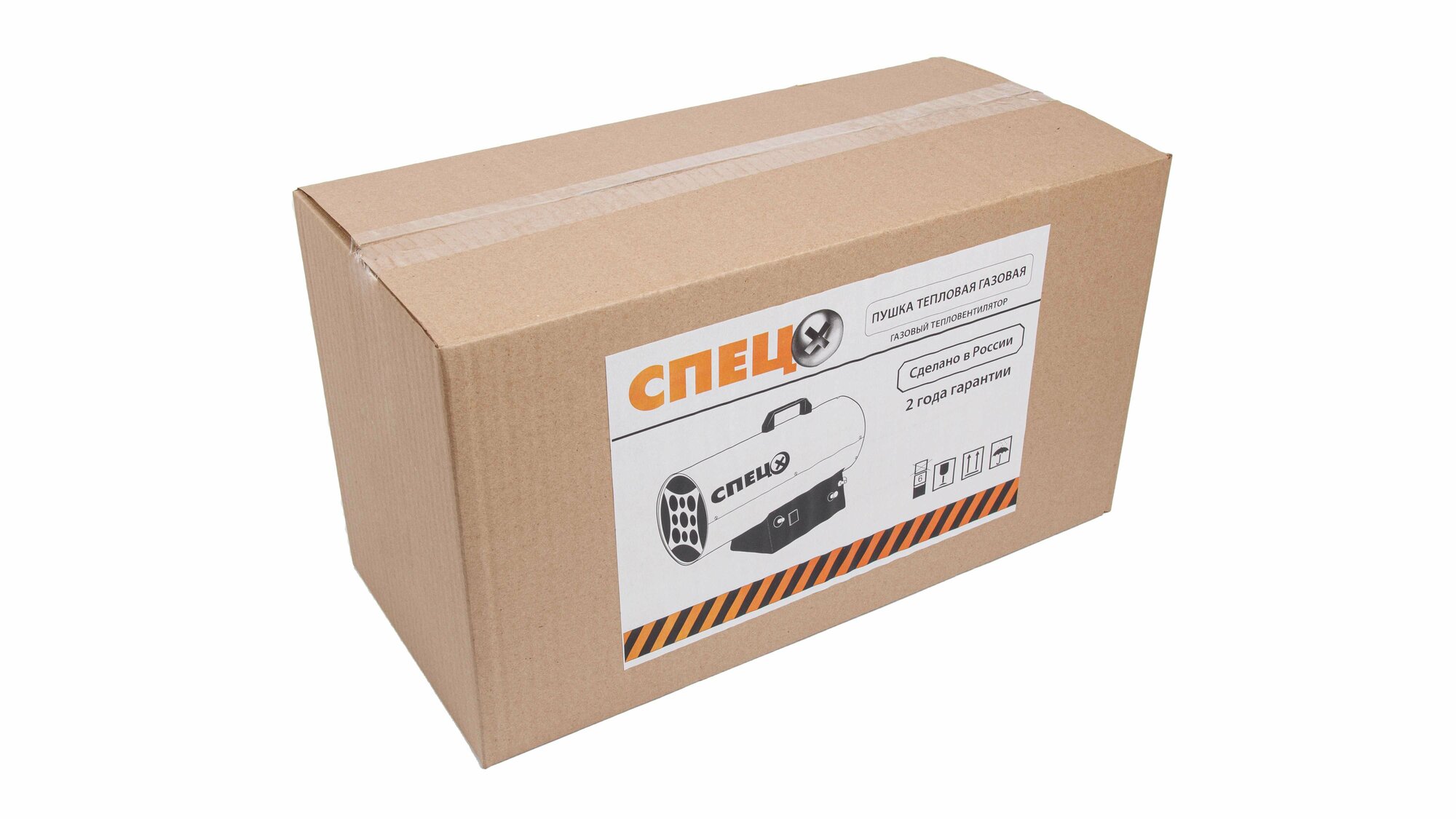 Пушка тепловая «Спец» используется для нагревания воздуха за счет тепла, получаемого от сгорания газа — пропана или бутана. Предназначена для обогрева промышленных помещений, поддержания в них заданной температуры в течение длительного времени, сушки воздуха, отогревания замерзших трубопроводов. Тепловая мощность устройства — 15 кВт. Размеры изделия — 190 × 290 × 440 мм. Страна производства — Россия.