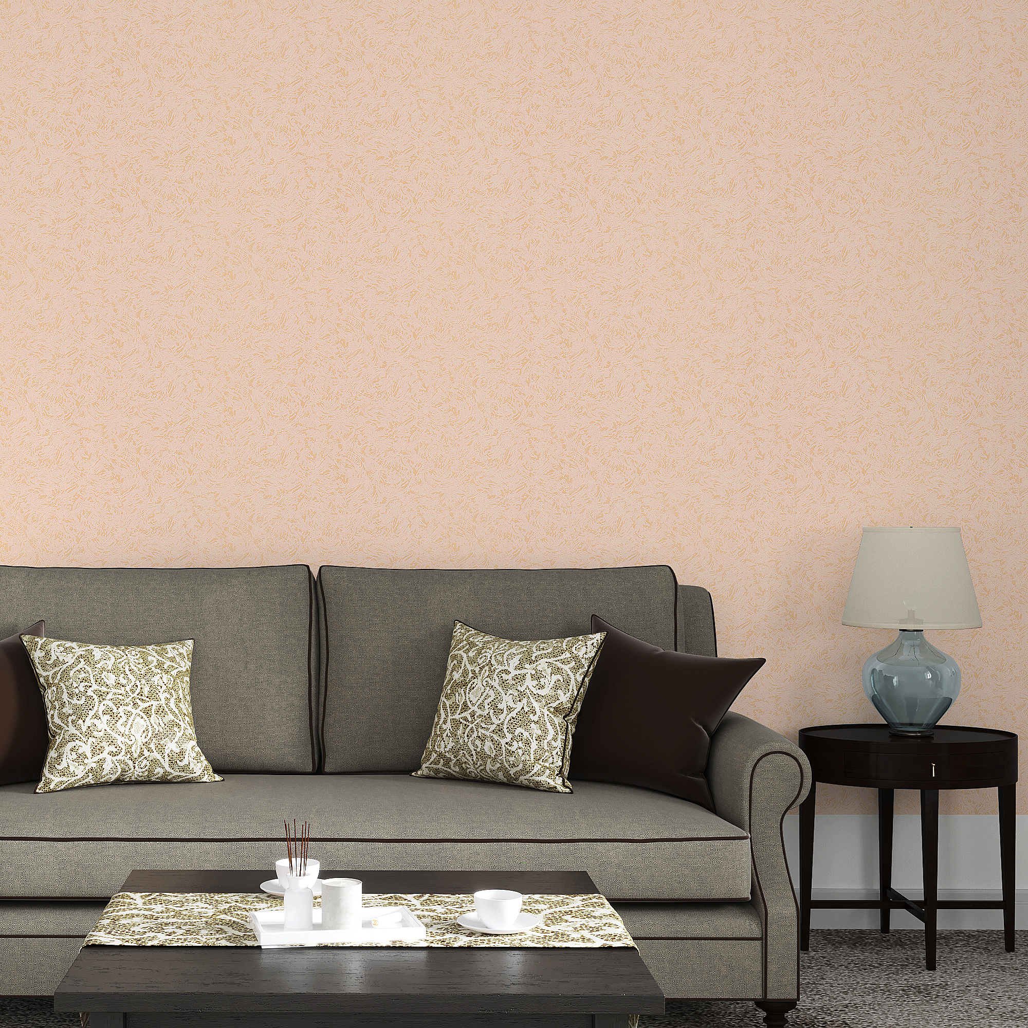 Обои имитируют штукатурку, цвет — бежевый. Данный вид обоев можно неоднократно перекрашивать специальной эмульсией, с незначительными затратами обновляя интерьер. Виниловая поверхность обеспечивает равномерное распределение краски без разводов.