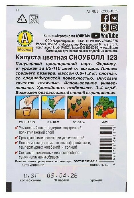 Купить капусту цветную «Сноуболл 123» можно прямо сейчас: в Leroy Merlin представлены семена с маркировкой «Аэлита».