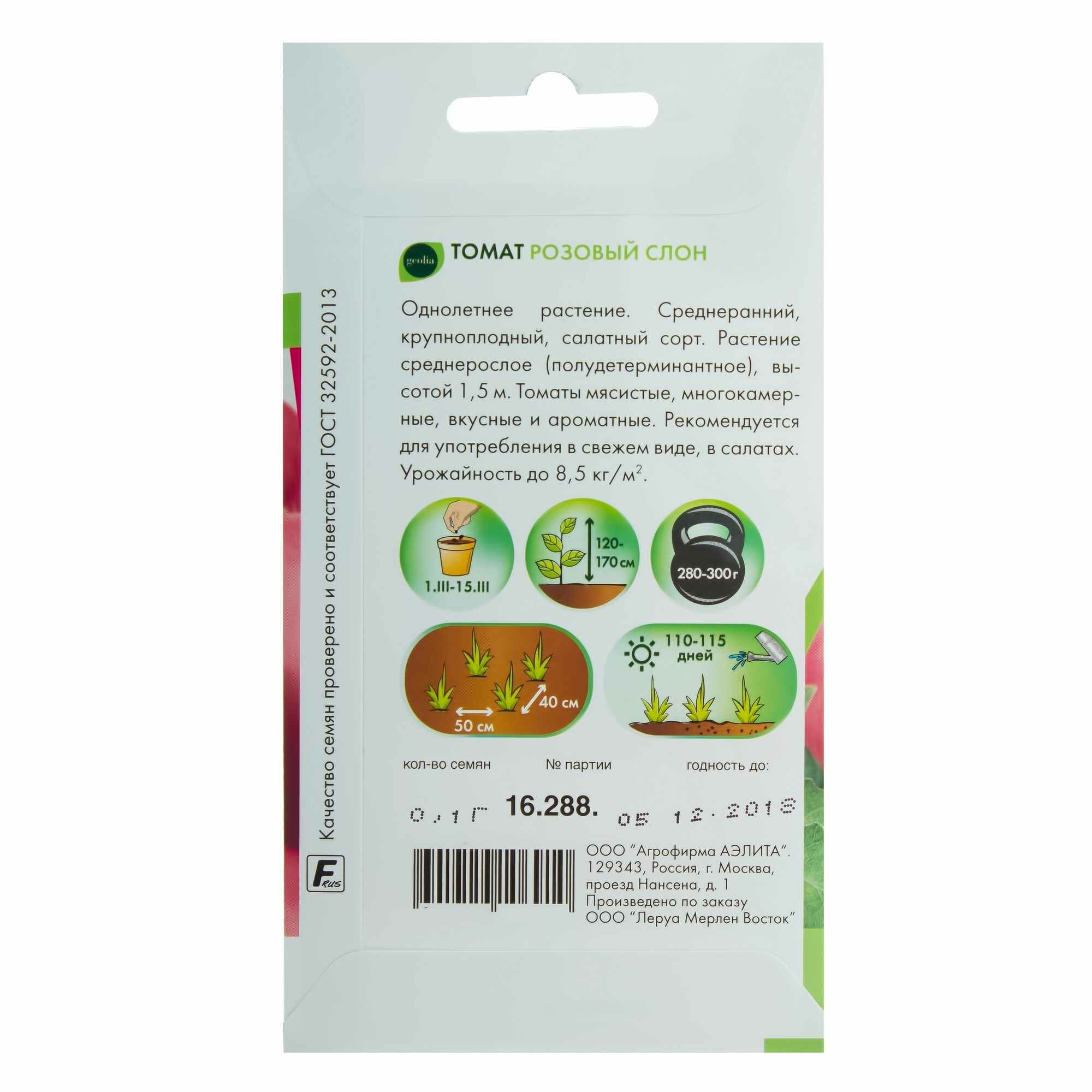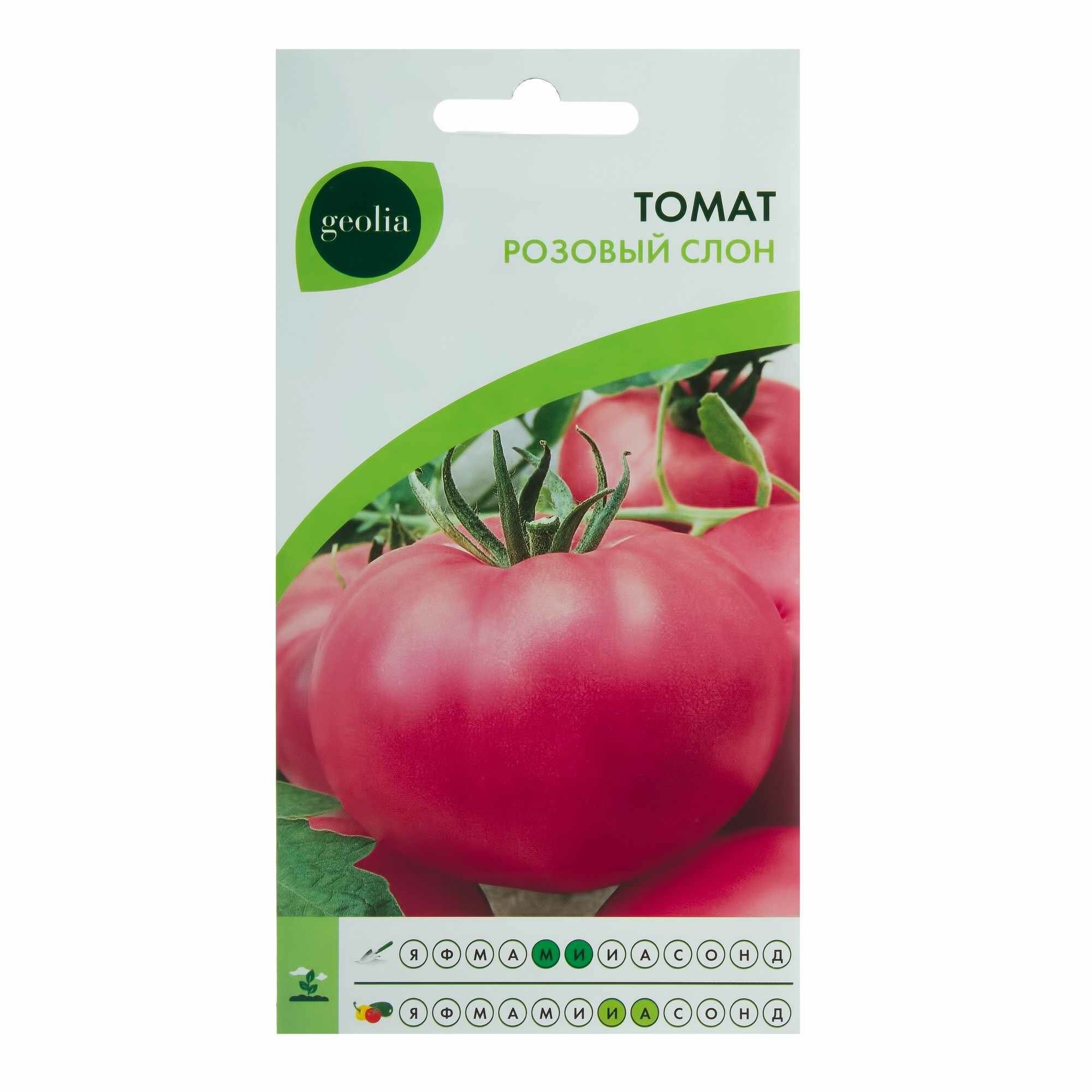 Томат Geolia «Розовый слон» — крупноплодный салатный сорт со среднеранним сроком созревания. Полудетерминантный куст вырастает в среднем до 1,5 м. Формирует ароматные, вкусные помидоры с мясистой мякотью и множеством камер. Средний вес — 280-300 г. Растение отлично плодоносит — урожайность составляет 8,5 кг/м².