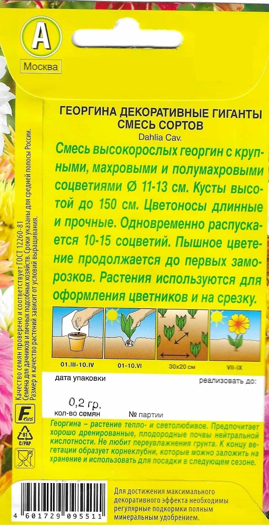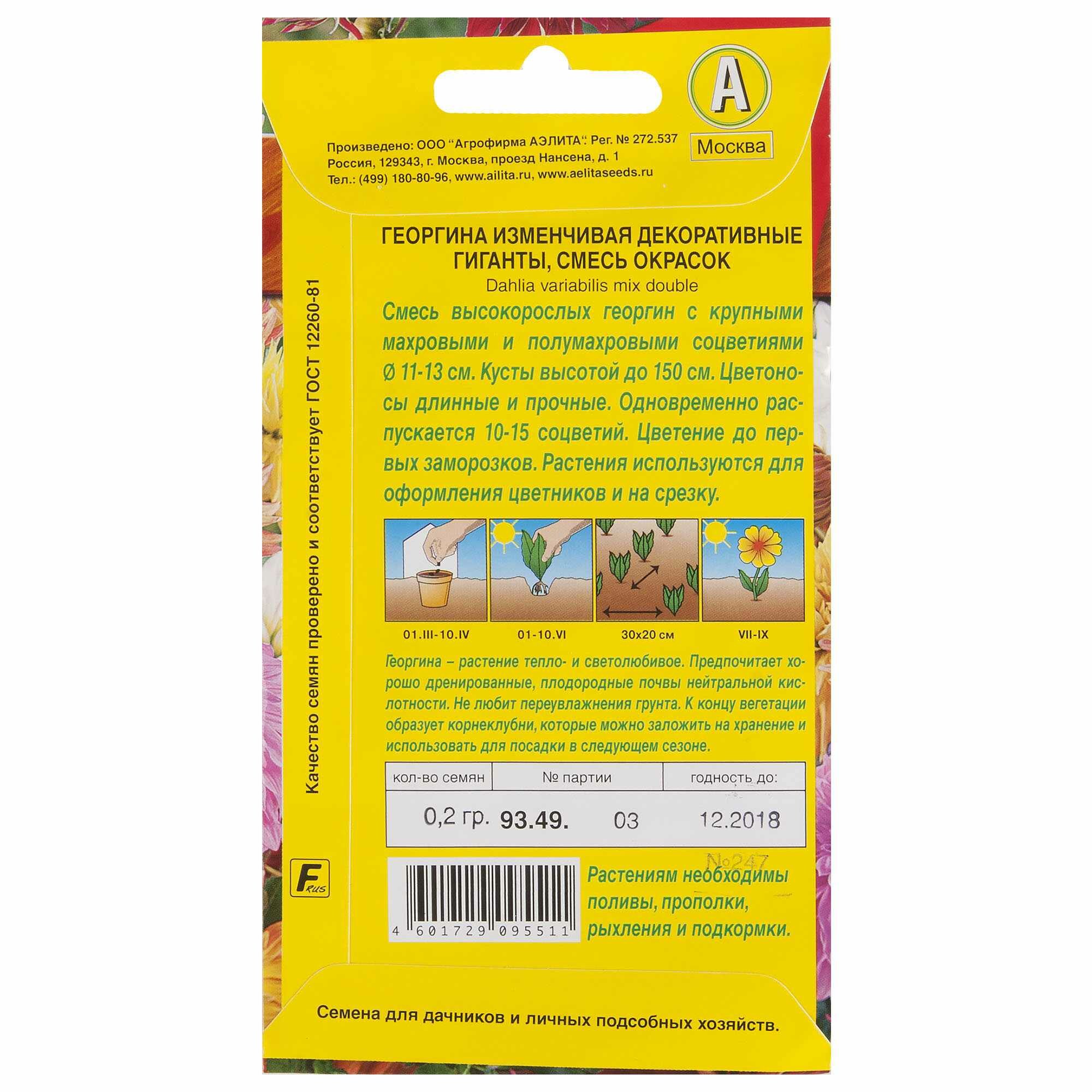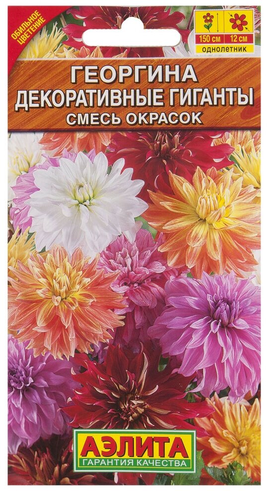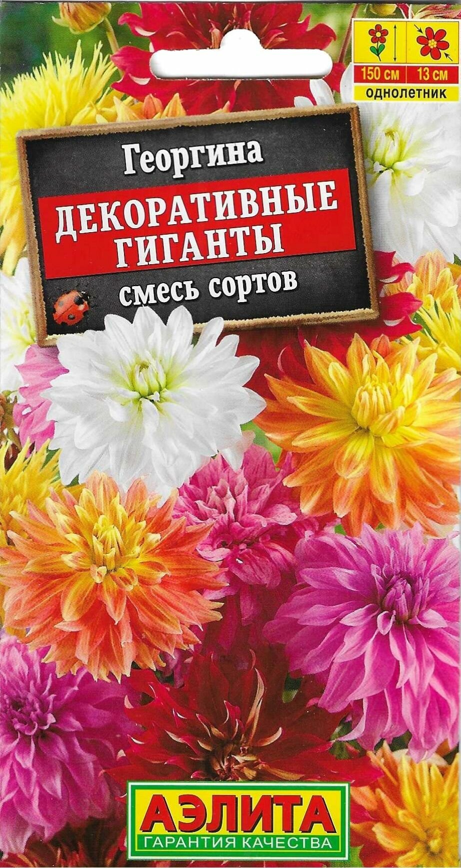 Георгина «Декоративные гиганты» — смесь семян высокорослых (до 150 см) растений с полумахровыми соцветиями разных оттенков. Цветы диаметром 11-13 см располагаются на длинных и мясистых цветоносах, отлично смотрятся в срезке. Период цветения — с июля до заморозков. Культура любит свет, тепло, дренированные почвы и очень умеренный полив. Посев на рассаду производят в марте-апреле, высадку в грунт — в июне.