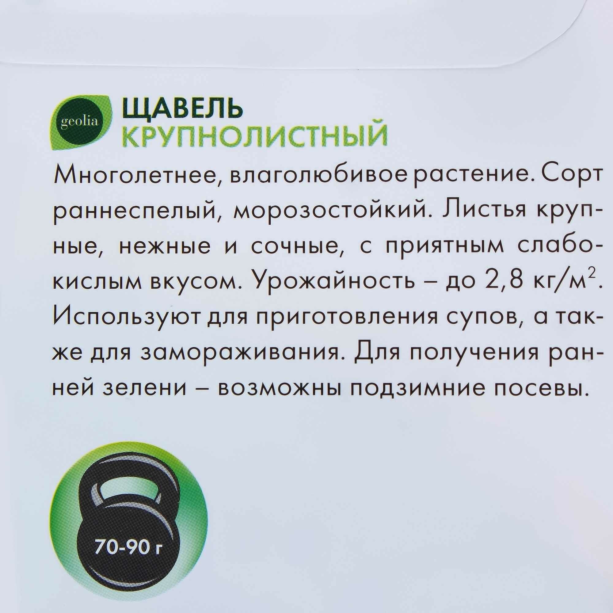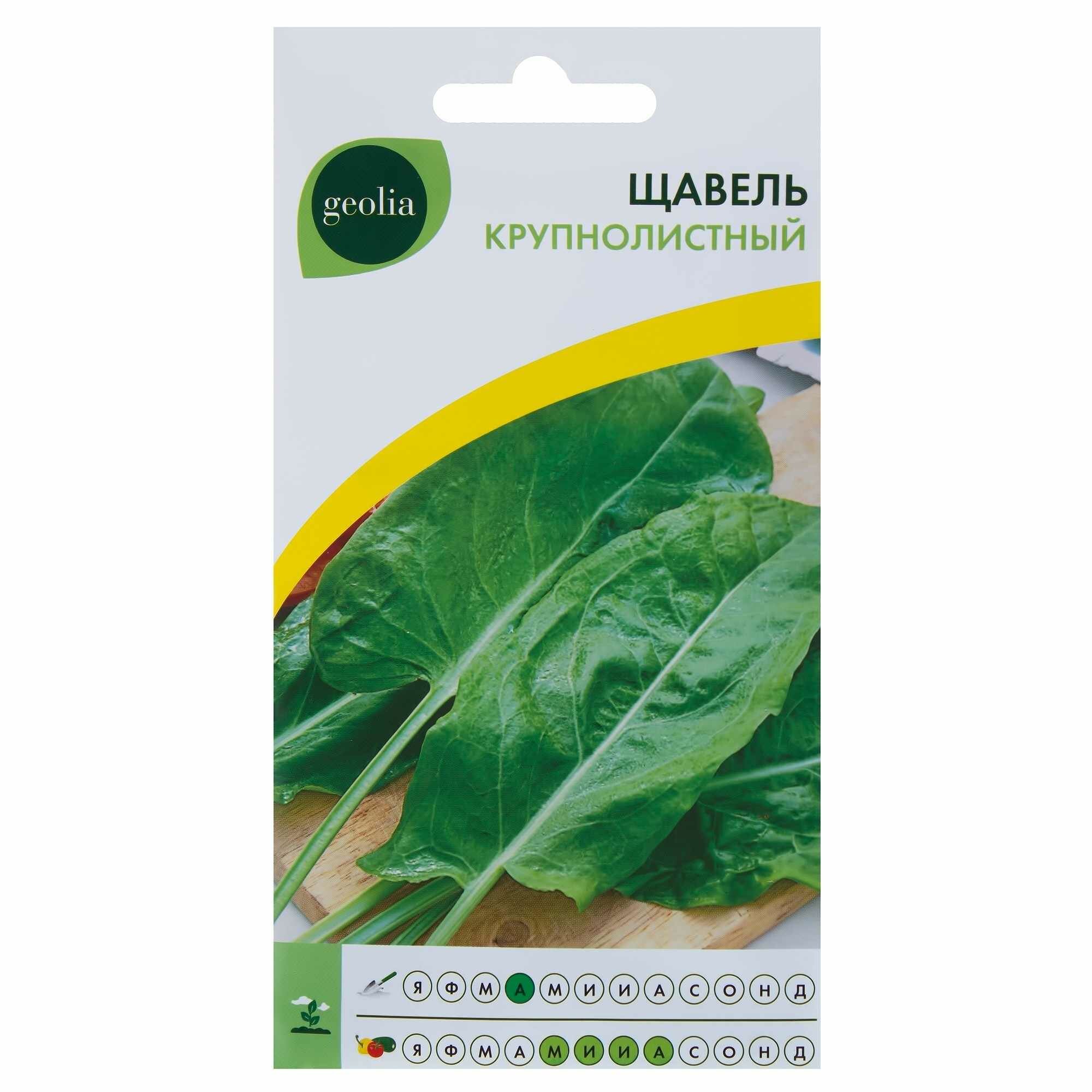 Щавель Geolia «Крупнолистовой» — морозостойкий многолетник с нежным слабокислым вкусом. Рано достигает технической спелости — срезку зелени проводят на 30-35 день от появления всходов, отличается высокой урожайностью — до 2,8 кг/м². Широко используется в кулинарии при приготовлении супов, соусов, гарниров, пирогов, киселей, подходит для замораживания.