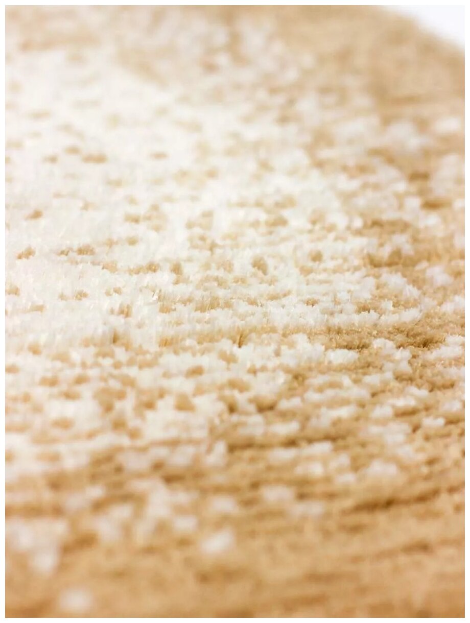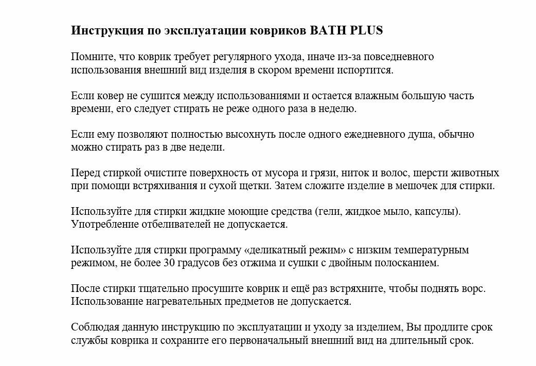 Коврик петлевой. Основной материал — 100% полиэстер, цвет — бежевый. С обратной стороны латексное антислиповое покрытие, благодаря чему коврик не ерзает по полу и не выскальзывает из-под ног. Уход — стирка при 30 °C. Гладить коврик нельзя.