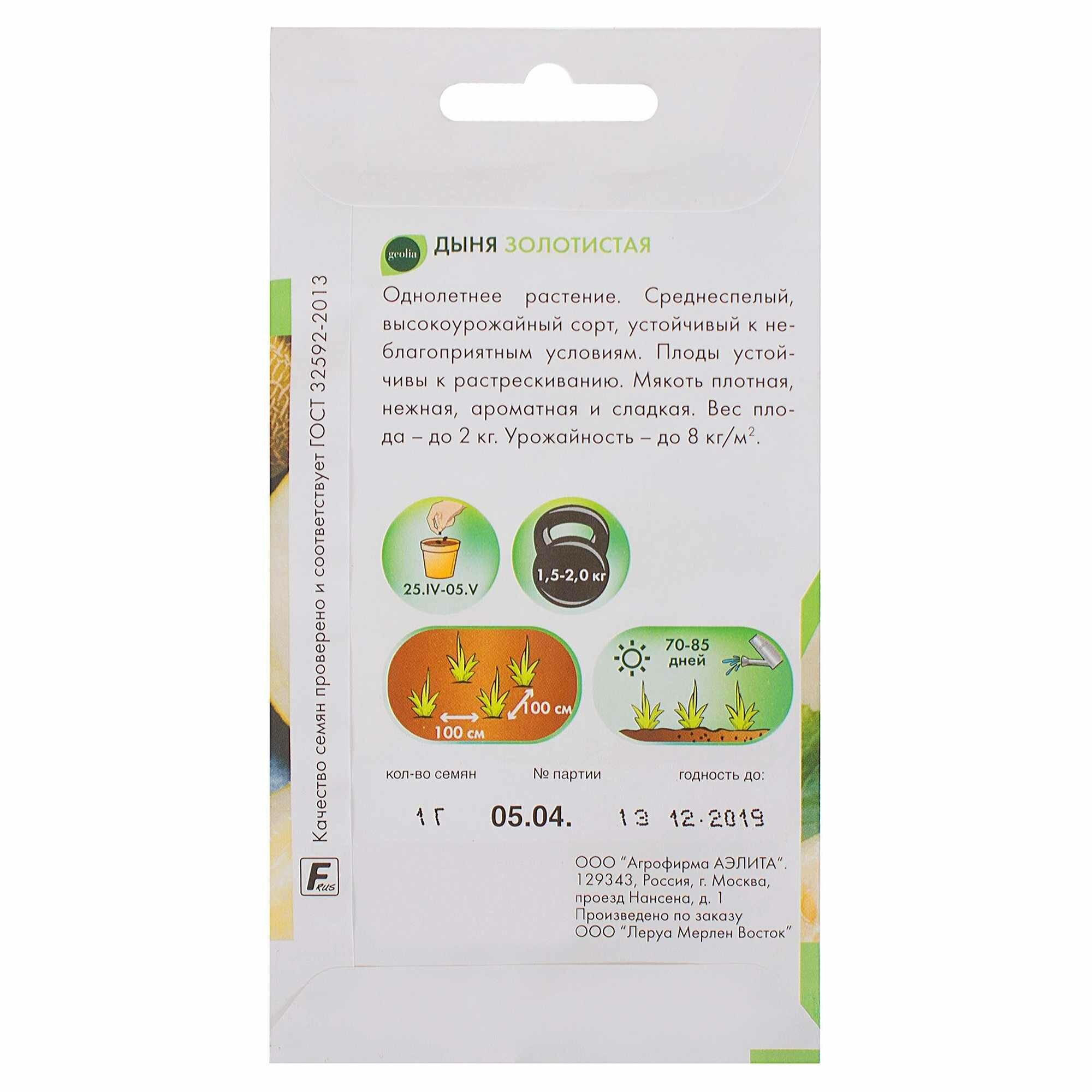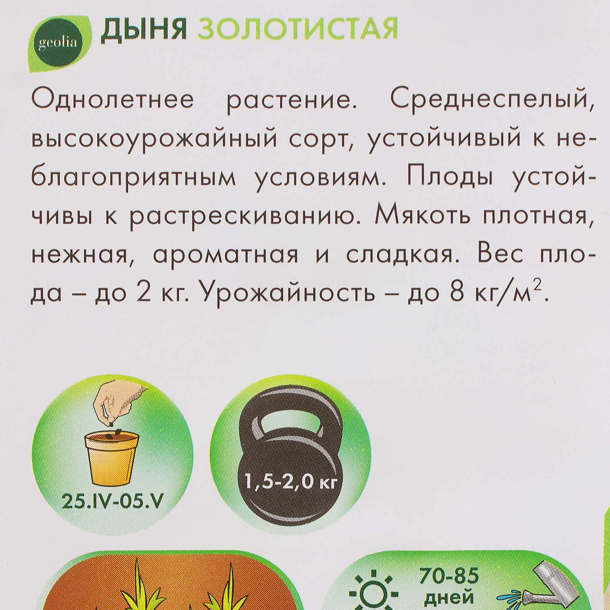 Дыня Золотистая, Geolia – является среднеранним сортом. Плоды этой дыни достигают веса 1,5-2 кг, имеют компактный размер. Мякоть плотная, очень ароматная, сочная и вкусная. Растение однолетнее, главной характеристикой которого считается высокая урожайность. Стебель стелющийся и ветвящийся. Дыня Золотистая – растение южное, совершенно не переносит холод и полив холодной водой.