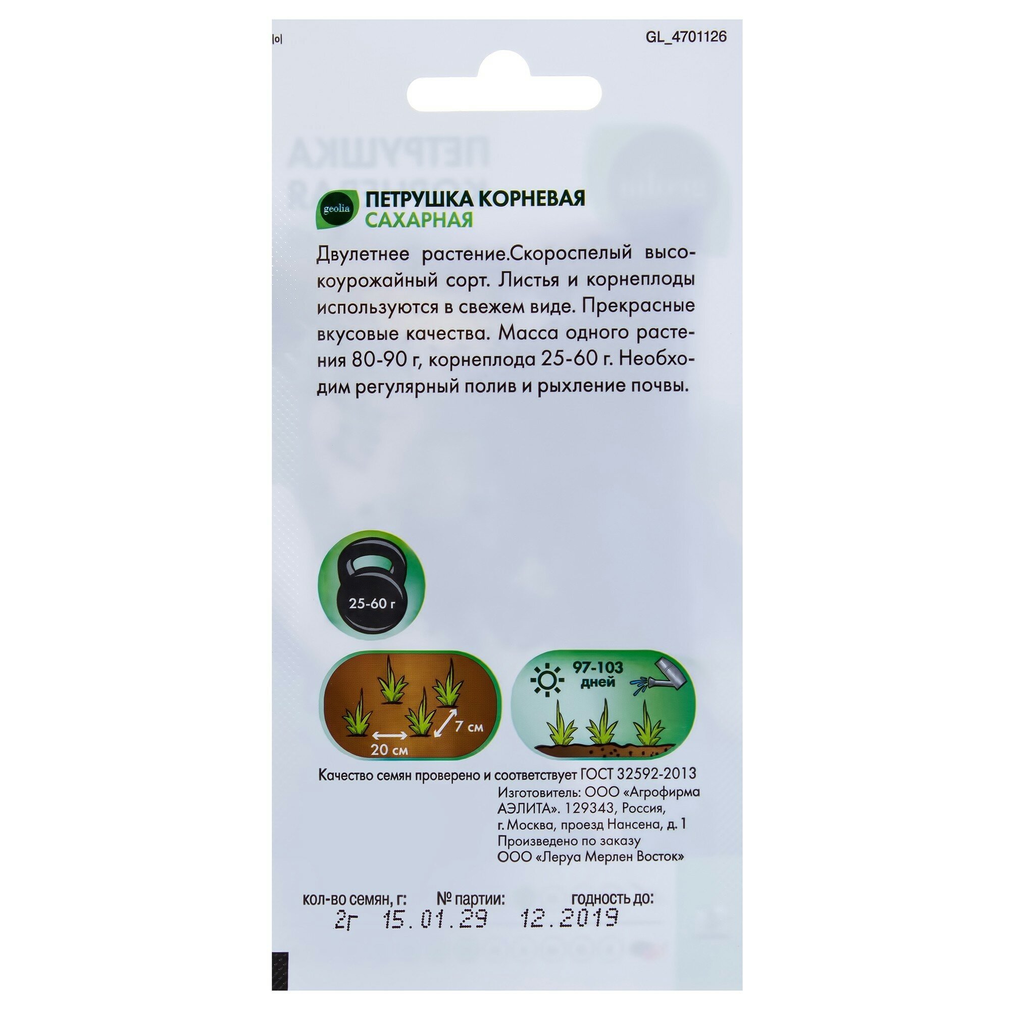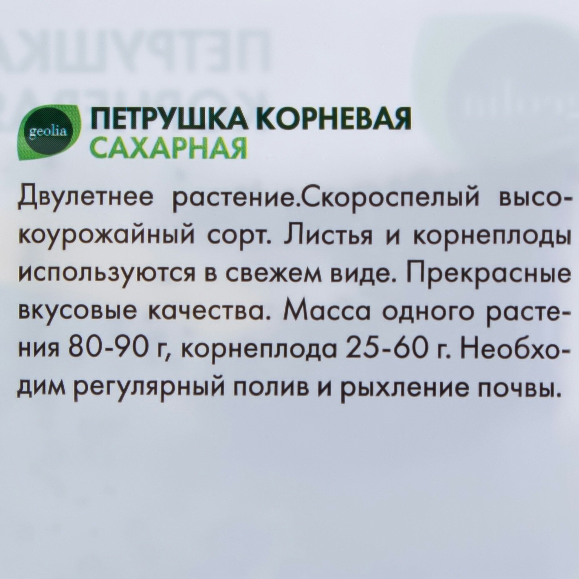 Петрушка корневая Сахарная, Geolia – это ценная пряная культура, в которой содержится комплекс витаминов и минеральных веществ. Сорт отличается высокой урожайностью и раннеспелостью. Листья сформированы в мощную и раскидистую розетку. Растение дает корнеплод конической формы, длина которого составляет 20-30 см. Именно за особенности корнеплода данный сорт получил широкую популярность у садоводов: его мякоть белая, сердцевина светло-желтого оттека, отличные вкусовые качества, отсутствуют боковые корни. Листья и корнеплод петрушки Сахарной подходят для многих рецептов домашней кулинарии и хранения.