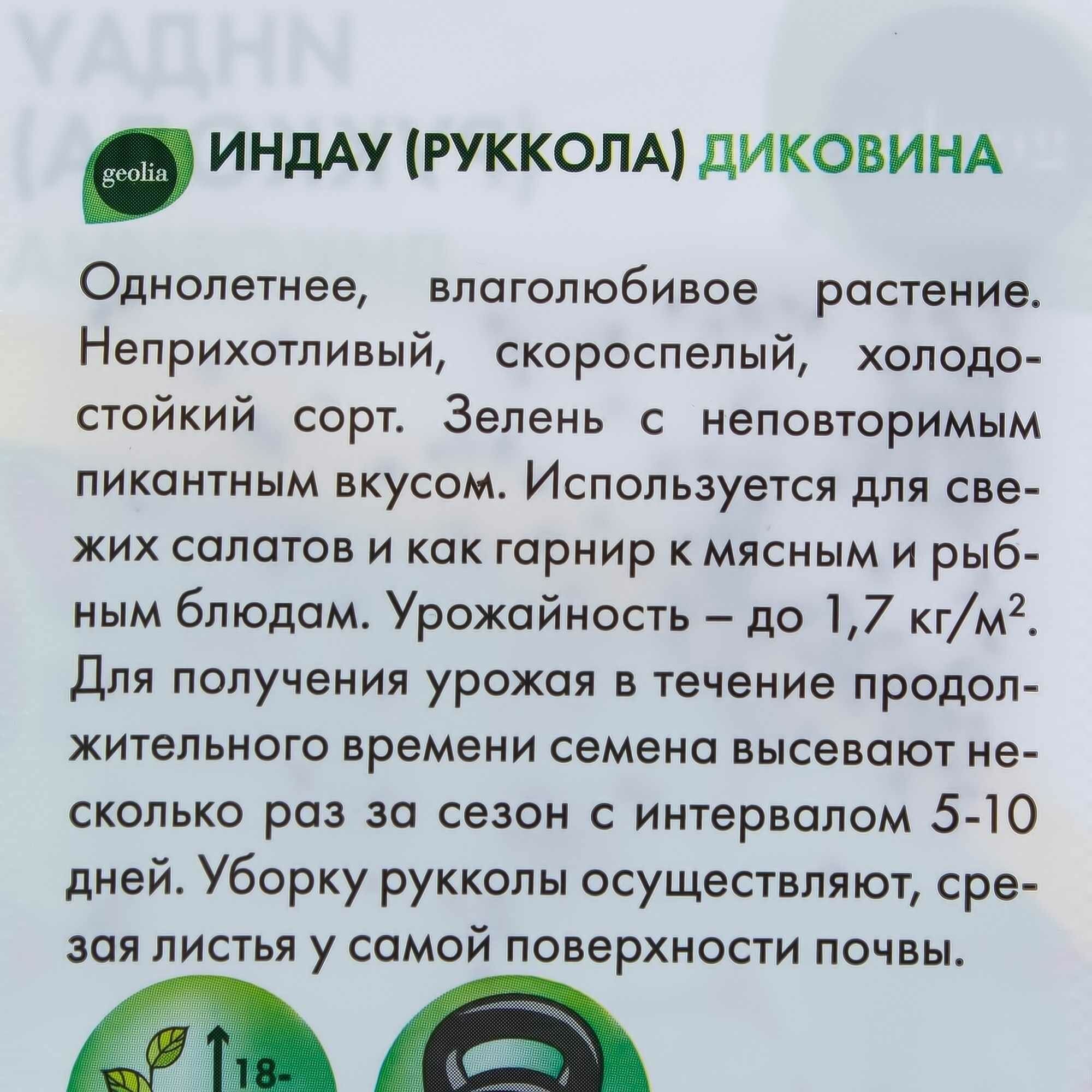 Руккола Индау Диковина, Geolia – сорт скороспелый, с момента всхода семян до начала сбора первого урожая пройдет всего 14 дней. Зеленые листья лировидной формы среднего размера собраны в полуприподнятую розетку. Руккола обладает особым и запоминающимся вкусом, напоминающим острую горчицу. Хладостойкое и влаголюбивое растение. Ценится за долгую сохранность товарного вида и позднее стрелкование. Удачно сочетается с рыбными и мясными блюдами.